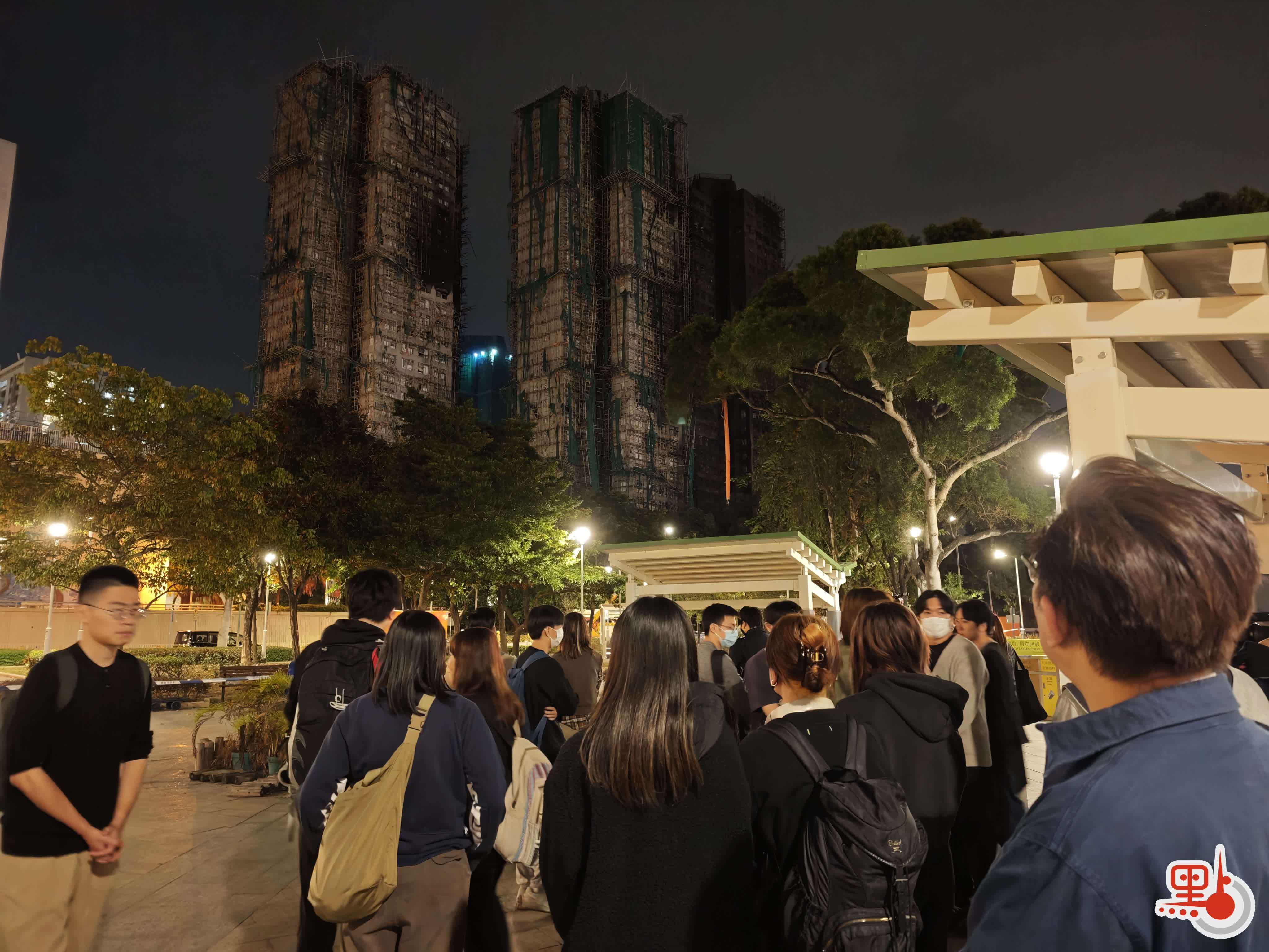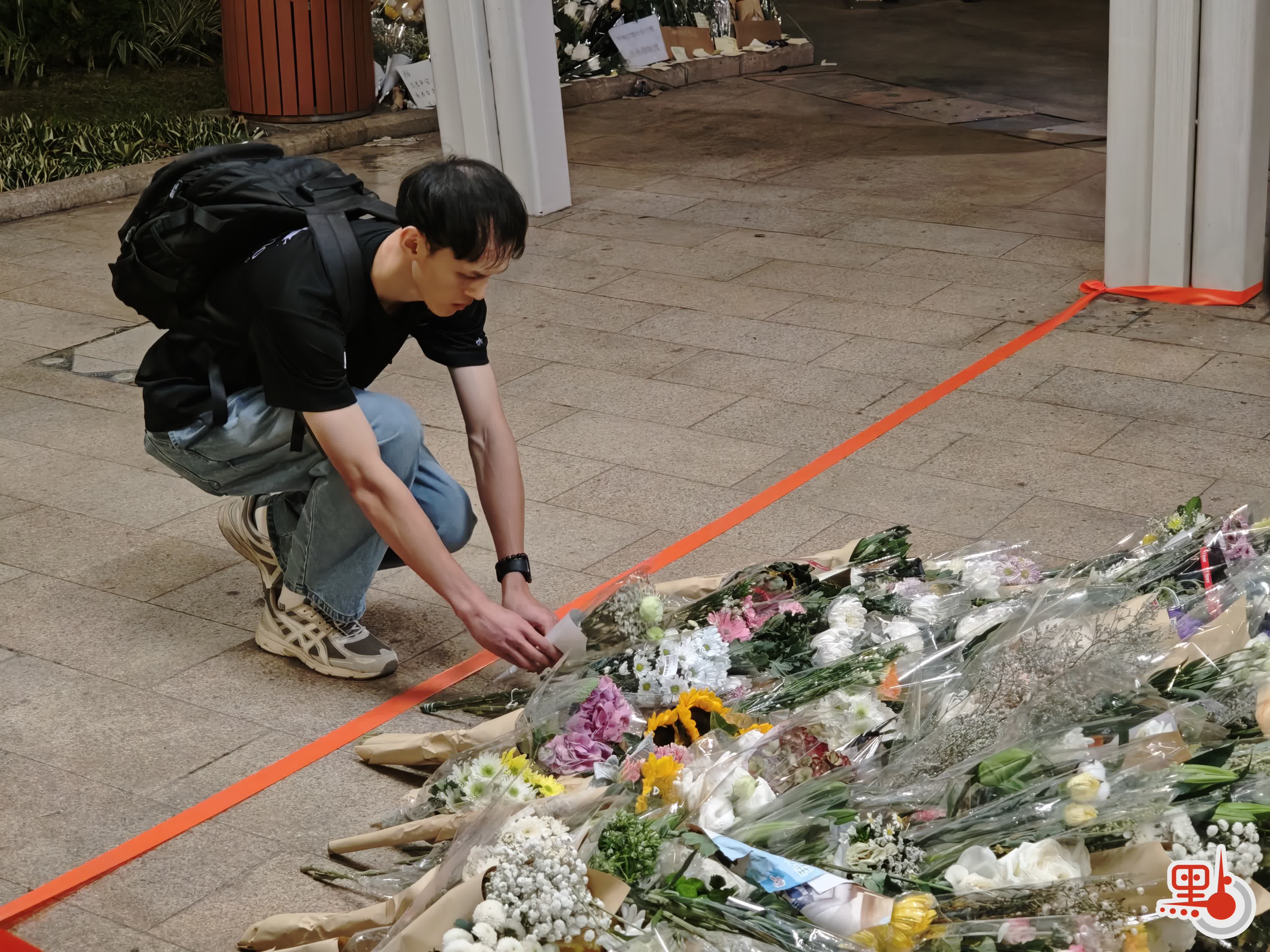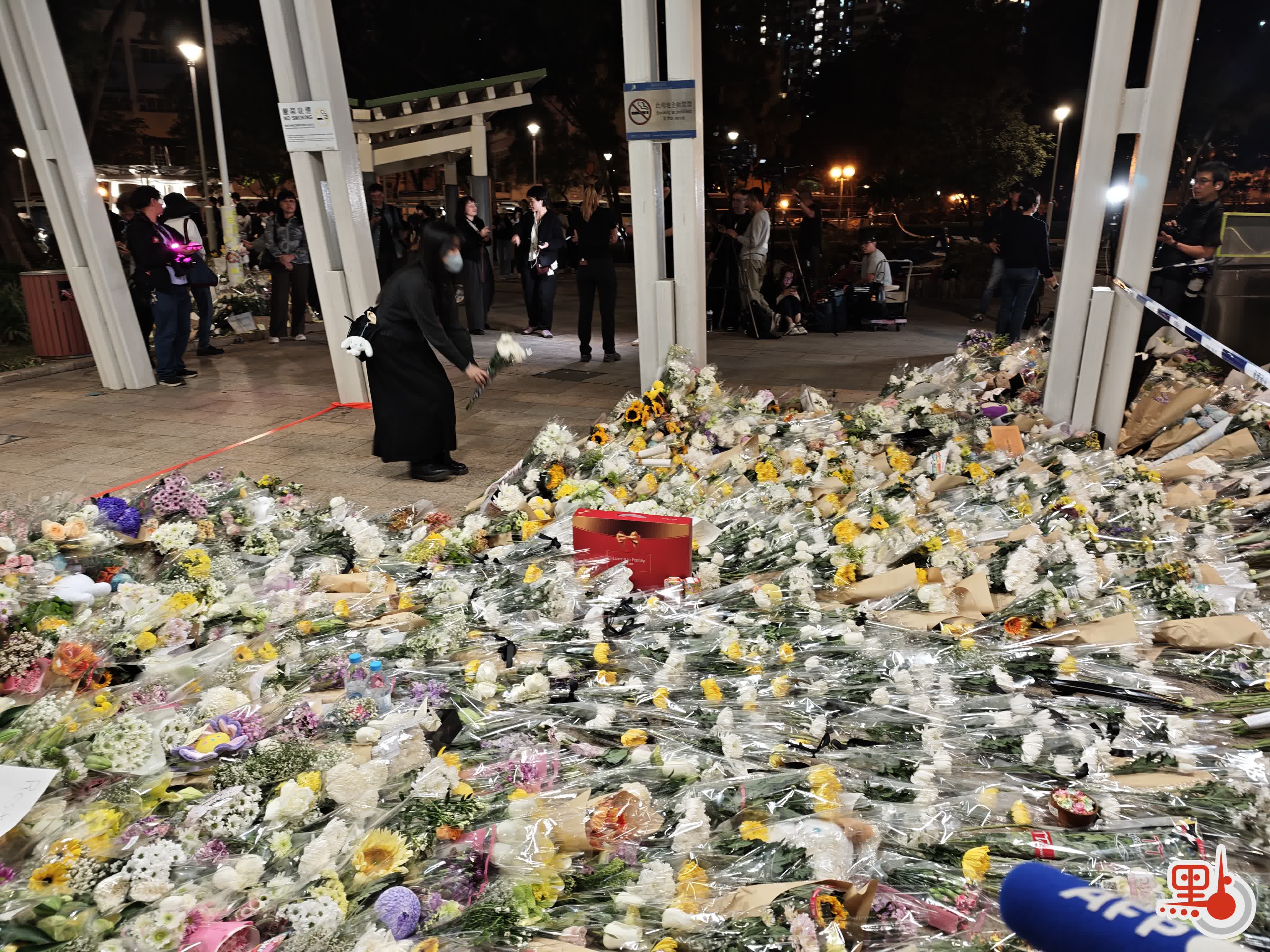 點新聞記者在現場目睹,下午5時許,廣場平台已出現獻花人龍,其後隊伍持續延長,直至晚上8時將整個廣場擠滿。市民有序排隊,輪流奉上花束,朵朵鮮花逐漸鋪陳於地面,匯聚成一片花海。獻花後的市民,駐足在宏福苑大樓前,久久不忍離開。