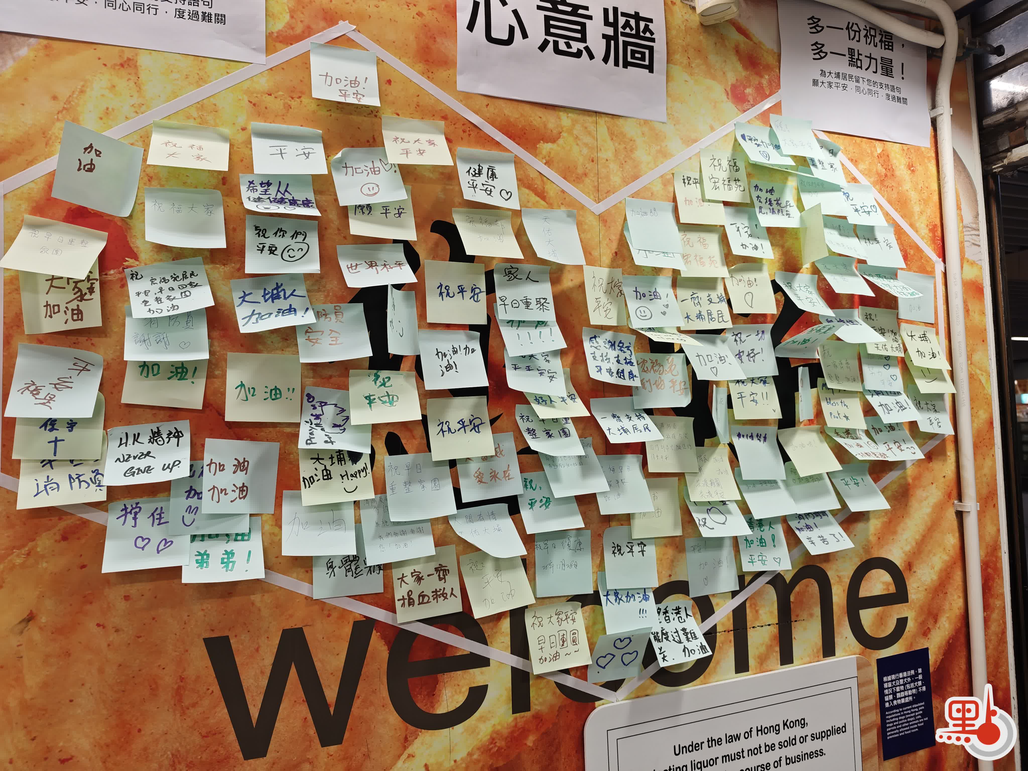 在宏福苑附近,有商戶設置心意墻,許多市民在此留言:「祝平安」、「天祐祖國香港」、「兩地人員善心善報」。
