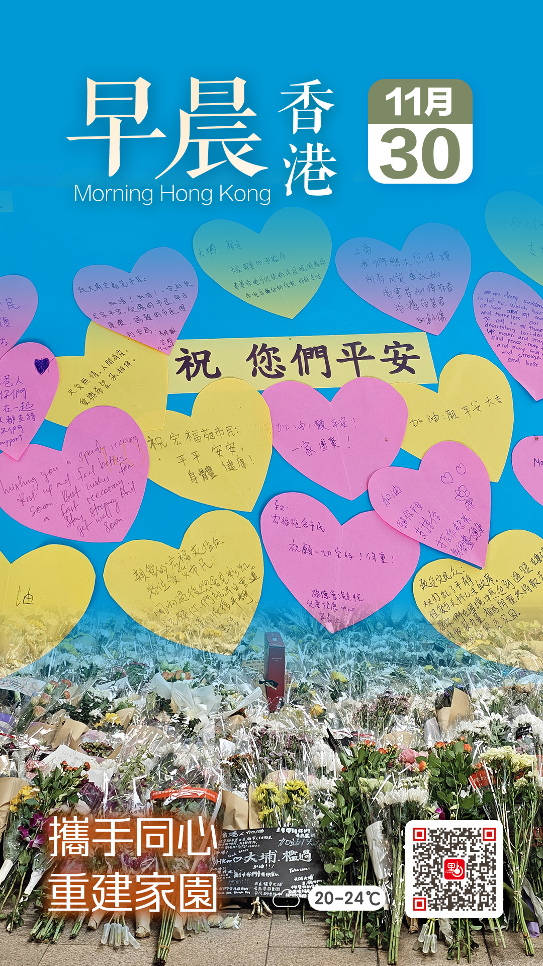 市民留言寫道:「祝宏福苑災民早日回復正常生活。」「大火打亂了平靜,但愛與關懷從未缺席,願你們在困境中感受到溫暖,在重建中收穫力量,相信陰霾終將散去,陽光總會照亮家園。」「風雨過後總會見彩虹,祝願你們能早日重建家園,恢復平靜的生活。」