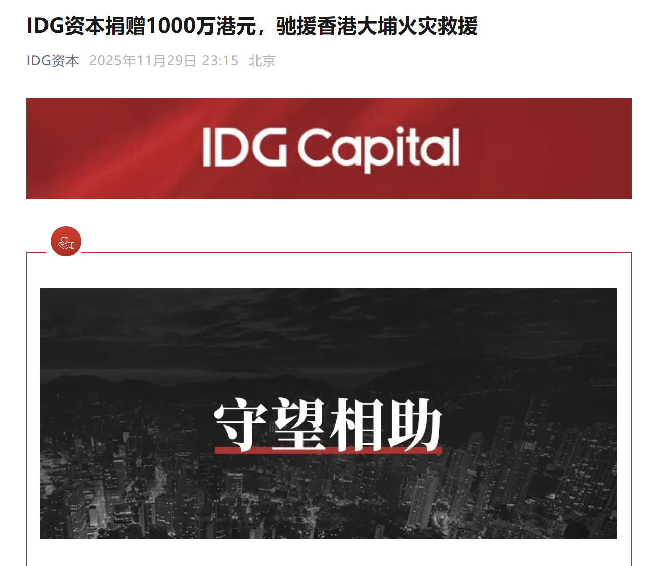 IDG資本表示,將持續關注災區需求,全力支持香港各界開展救援與重建工作。IDG資本亦向受災居民致以深切慰問,祈願所有傷者早日康復,受災家庭生活盡快恢復正常。