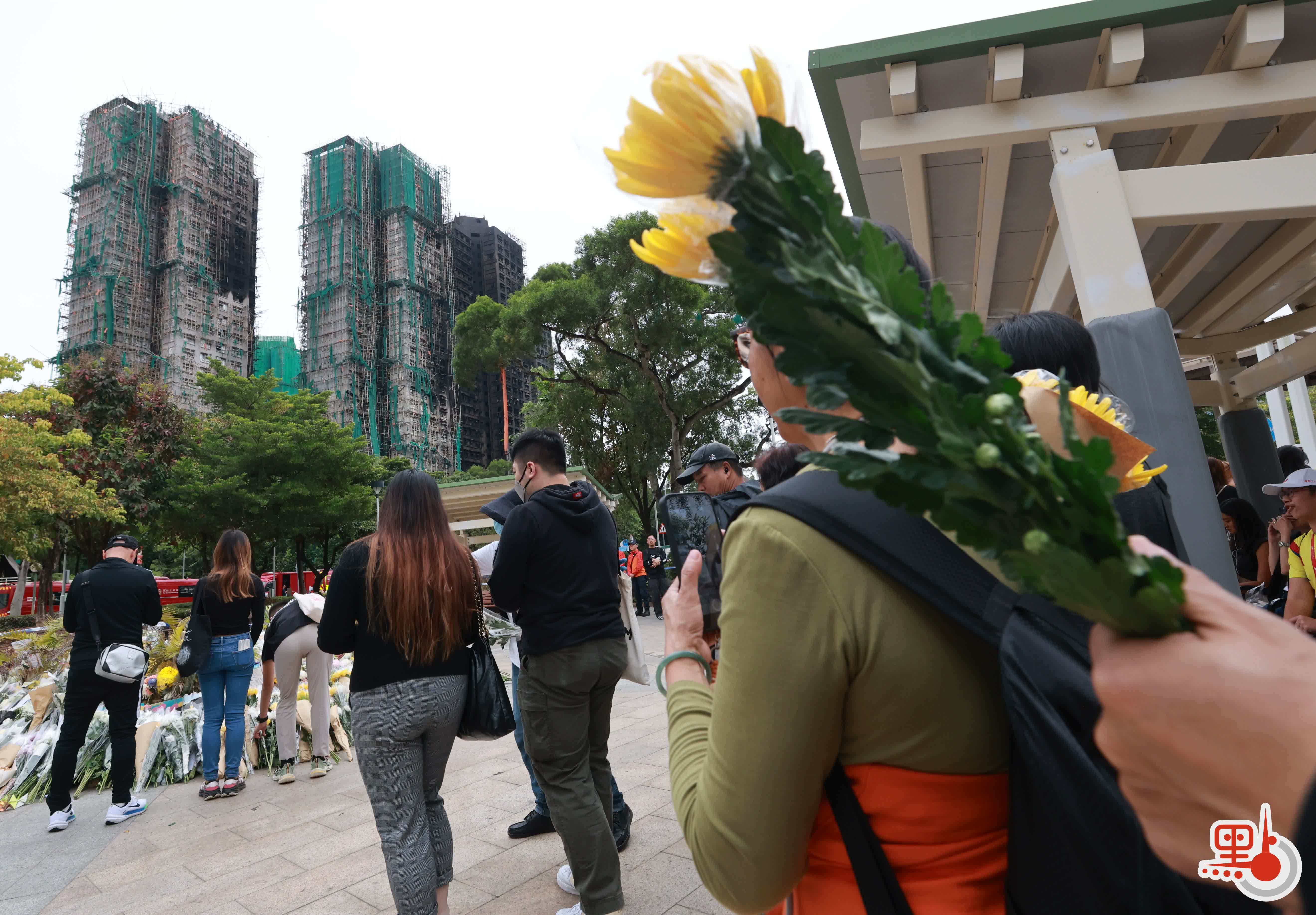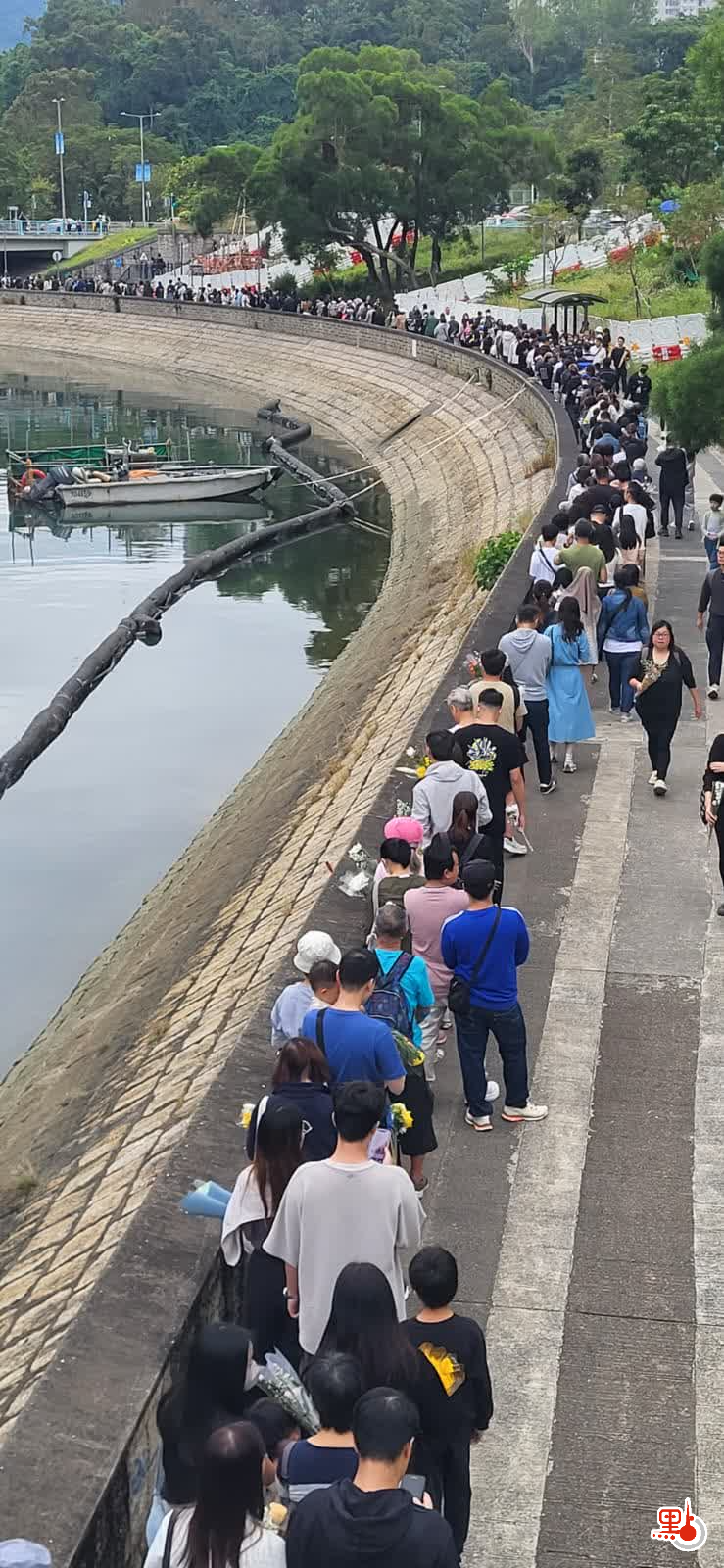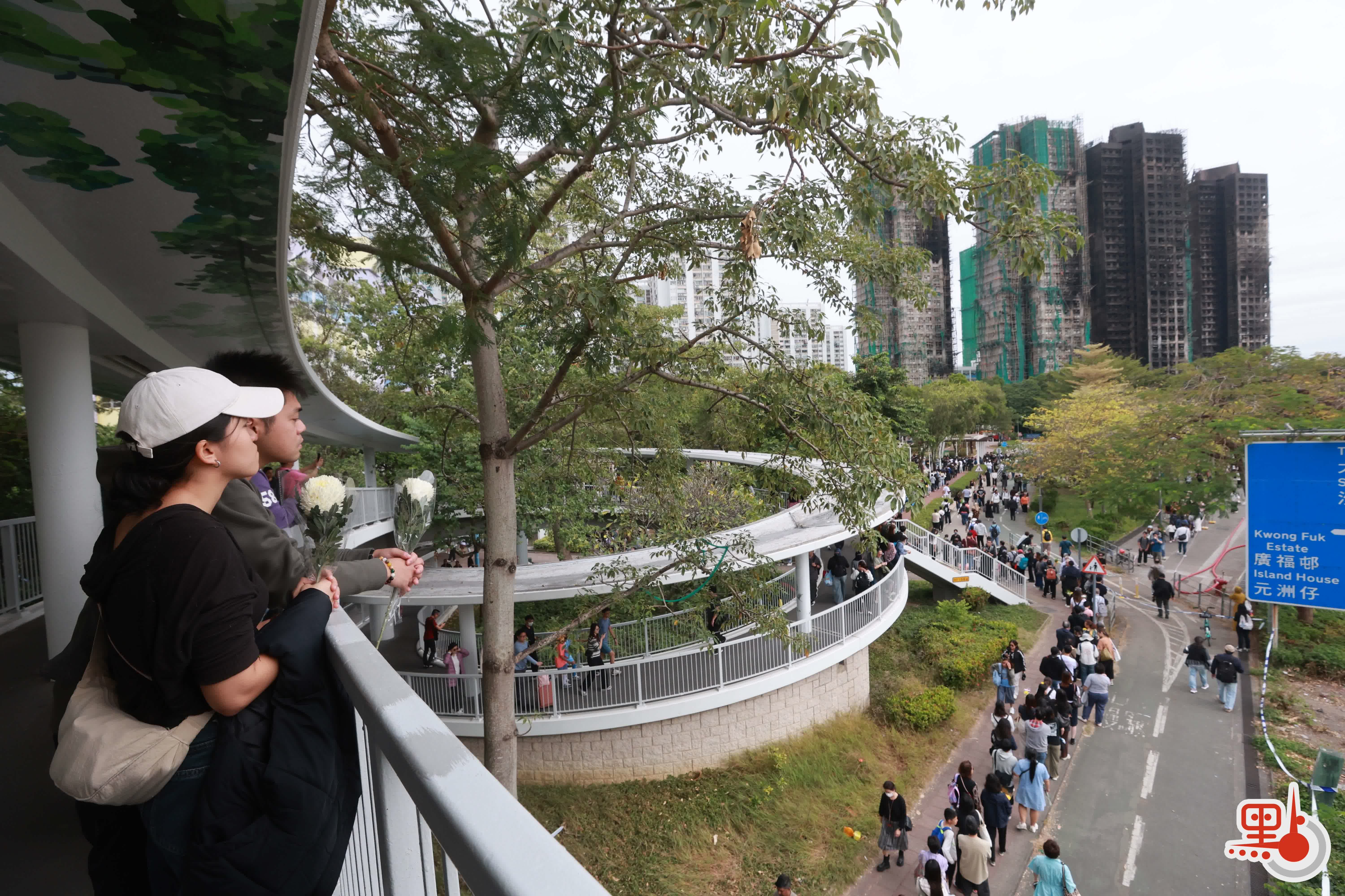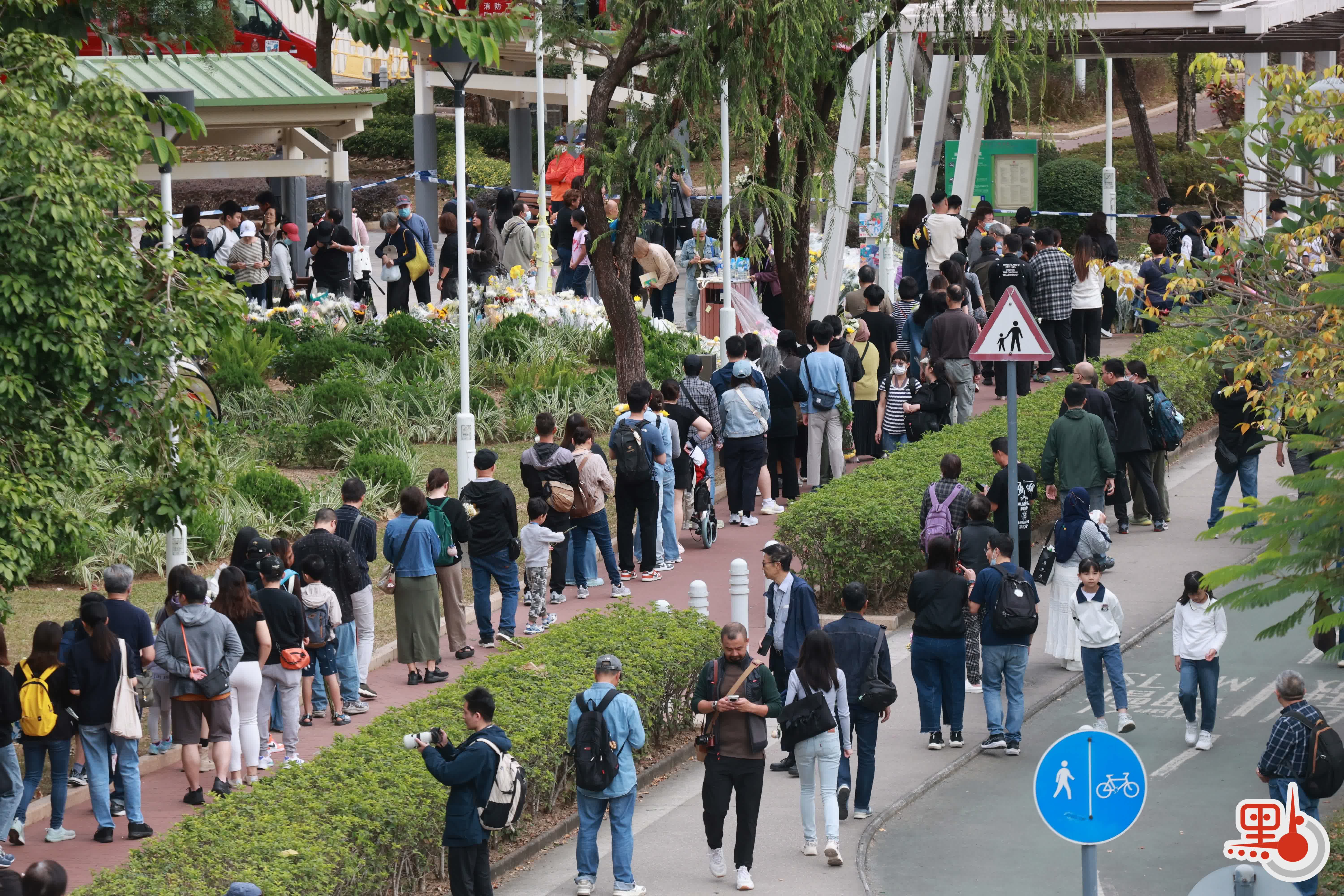 【點新聞報道】上周三(26日)在大埔宏福苑發生的五級大火,至今已釀成128人死亡,83人受傷及150人下落不明。在今日(11月30日)上午,前往大埔悼念的市民絡繹不絕,至少多達1000人,人龍一度延綿1.5公里,並伸延至東昌街社區會堂。他們在廣福休憩處放下鮮花,並寫上心意卡哀悼罹難者,願逝者能夠安息。