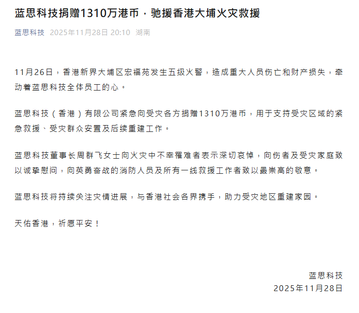 火災發生後,AI領域企業迅速響應。AIGC軟件A股上市公司萬興科技向香港大埔宏福苑援助基金捐贈100萬元,用於受災群眾救助、災後恢復及重建等工作。多家知名上市公司也紛紛伸出援手。藍思科技捐贈1310萬港元,公司董事長周群飛對火災中的不幸罹難者表示深切哀悼,並向一線救援人員表達敬意。三一集團迅速啟動響應協同機制,捐贈1000萬港元,展現了高效的公益執行力。愛爾眼科聯合愛眼公益基金會捐贈500萬港元。