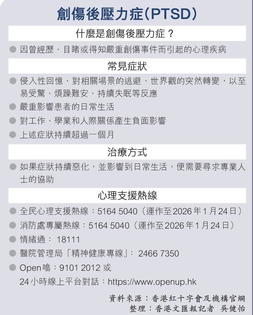 另一方面,這場大火帶來的創傷,早已超越地區界限,成為全港市民共同的情感負載。對於從媒體、網上看到有關新聞的普羅市民,張依勵表示,若市民持續感到困擾不安,便應向專業人士求助。而陳仲謀則建議,如果接觸有關資訊後感到悲傷,應「減少睇社交媒體」,以免引起不良情緒反應。
