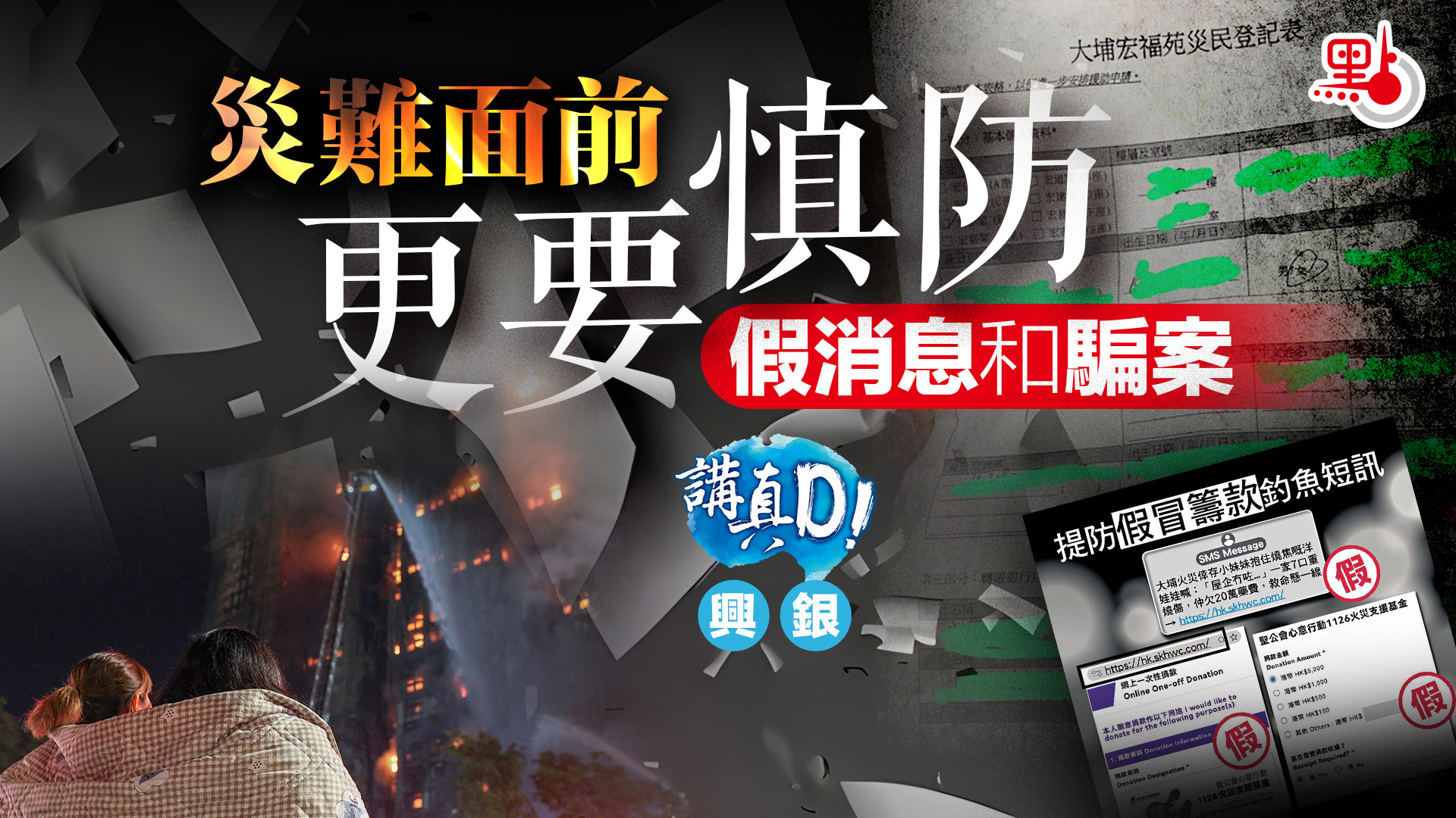 同時,面對大批災民喪失至親、家園盡毀這一慘況,更要警惕騙徒趁此災難時刻混水摸魚謀發災難財。有在事件中痛失家園的宏福苑居民連日來收到多通可疑電話,對方自稱是義工,以協助申請援助金為由,企圖騙取其個人資料;有騙徒更是假扮義工,使用虛假的「大埔宏福苑災民登記表」混水摸魚,騙取個人資料、銀行及信用卡資料,甚至要求填寫驗證碼;亦有騙徒利用慈善機構名義發出籌款的釣魚短訊,妄圖詐騙愛心市民的錢財,行為如同在災民傷口撒鹽,令人髮指。