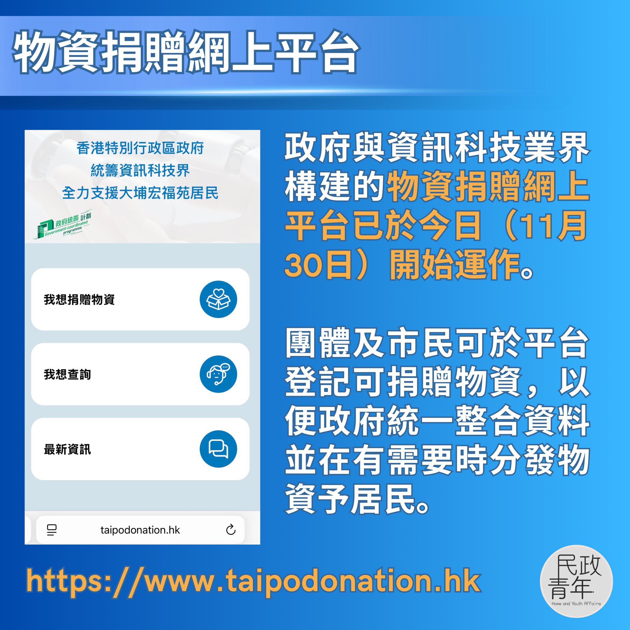 【點新聞報道】大埔宏福苑11月26日五級火造成嚴重傷亡,社會各界紛紛伸出援手,幫助受影響居民。財政司副司長黃偉綸今日(12月1日)在社交平台發文表示,物資捐贈網上平台已開始運作,團體及市民可於平台登記捐贈物資,以便政府統一分發物資予居民。