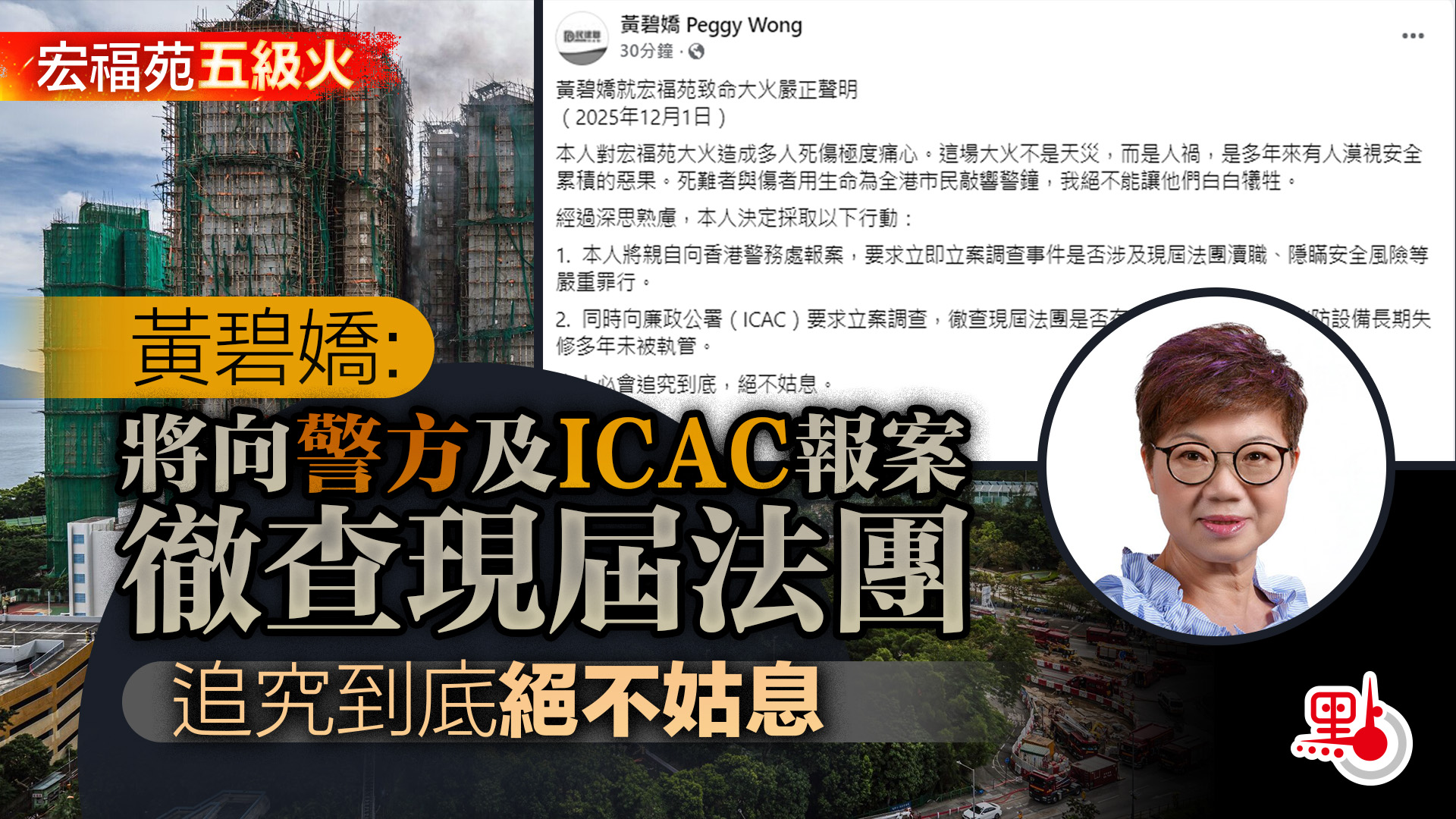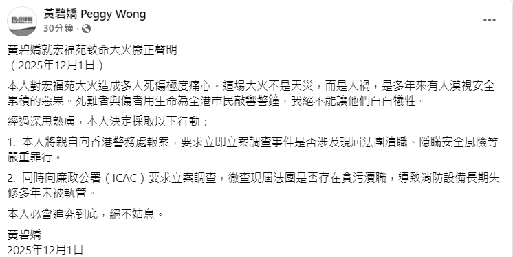 【點新聞報道】香港大埔宏福苑五級大火,造成重大人員傷亡和財產損失。今次屋苑大維修涉及逾3億元工程,由上一屆業主立案法團通過,曾任該屆法團顧問的民建聯大埔區議員黃碧嬌則捲入爭論。黃碧嬌今日(12月1日)發聲明表示,對宏福苑大火造成多人死傷極度痛心,稱「這場大火不是天災,而是人禍,是多年來有人漠視安全累積的惡果。死難者與傷者用生命為全港市民敲響警鐘,我絕不能讓他們白白犧牲。」她強調必會追究到底,絕不姑息。
