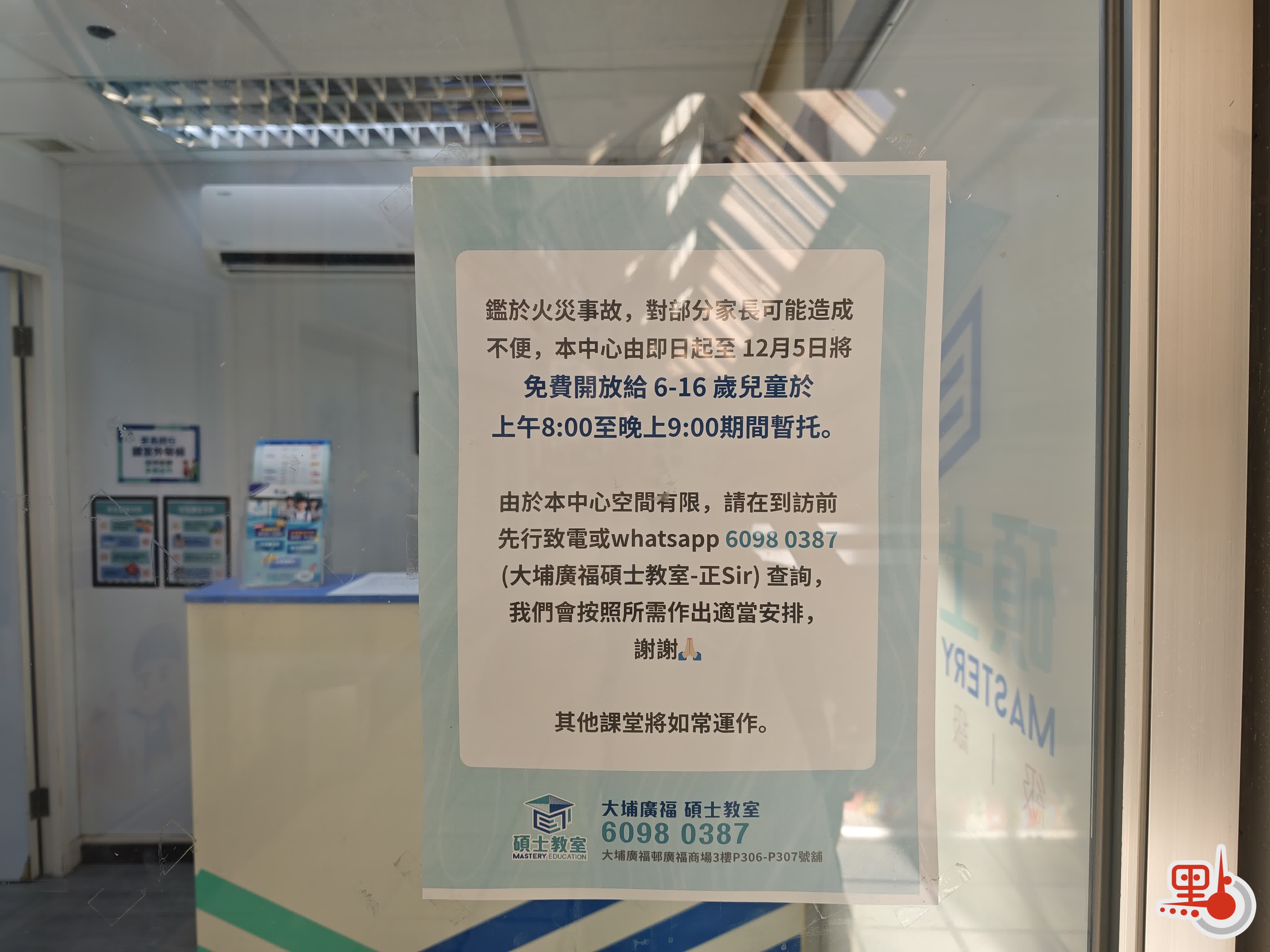 在食肆,有商戶打出「共渡時艱」,將全部正價減5元的優惠;一食肆則提供免費熱水。而在臨近的補習機構貼出告示,指由於火災影響,即日起至12月5日,將免費為6至16歲兒童於早上8時到晚上9時提供暫託服務。
