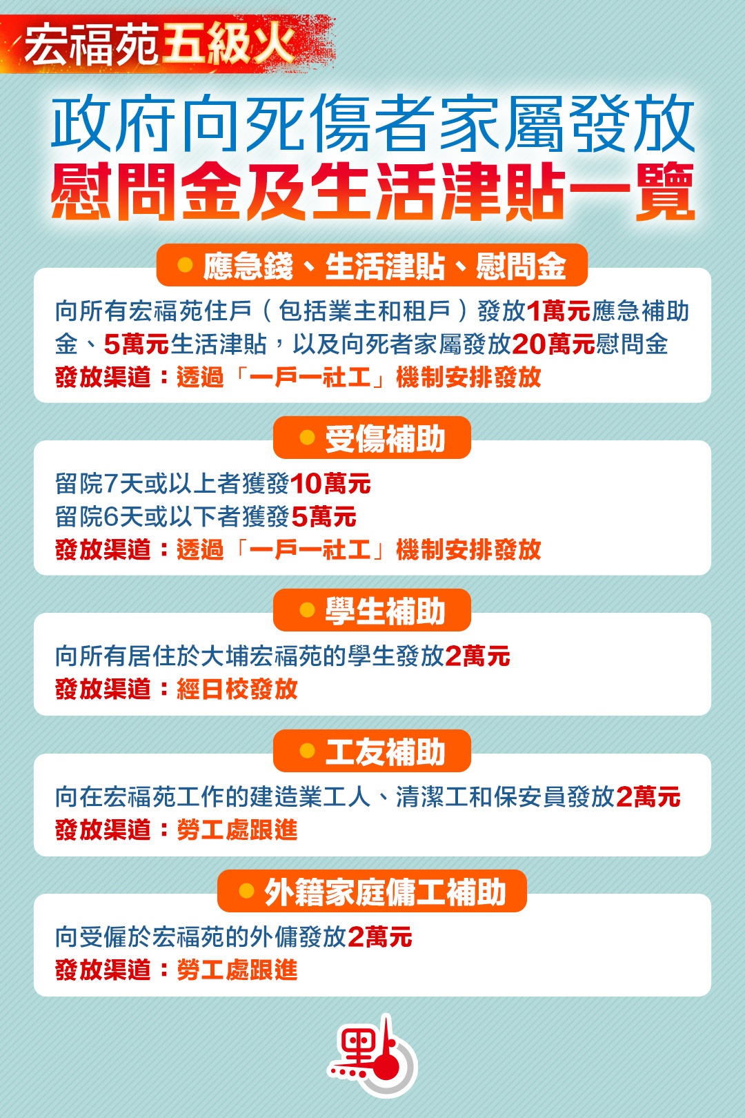 向在大埔宏福苑工作的建造業工人、清潔工和保安員發放2萬元特別補助,以支援他們不能如常開工或須重新添置生財工具的損失。工友補助由勞工處跟進。