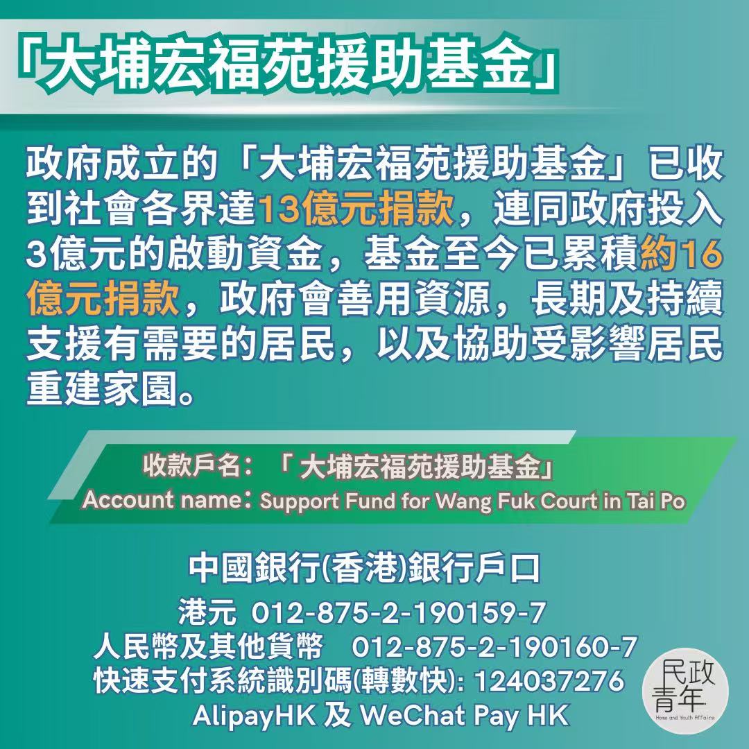 政府表示,成立的「大埔宏福苑援助基金」已收到的外界捐款達13億元,連同政府投入的3億元啟動資金,基金總額已有約16億元,會用在協助居民重建家園,是長期和持續的支援。