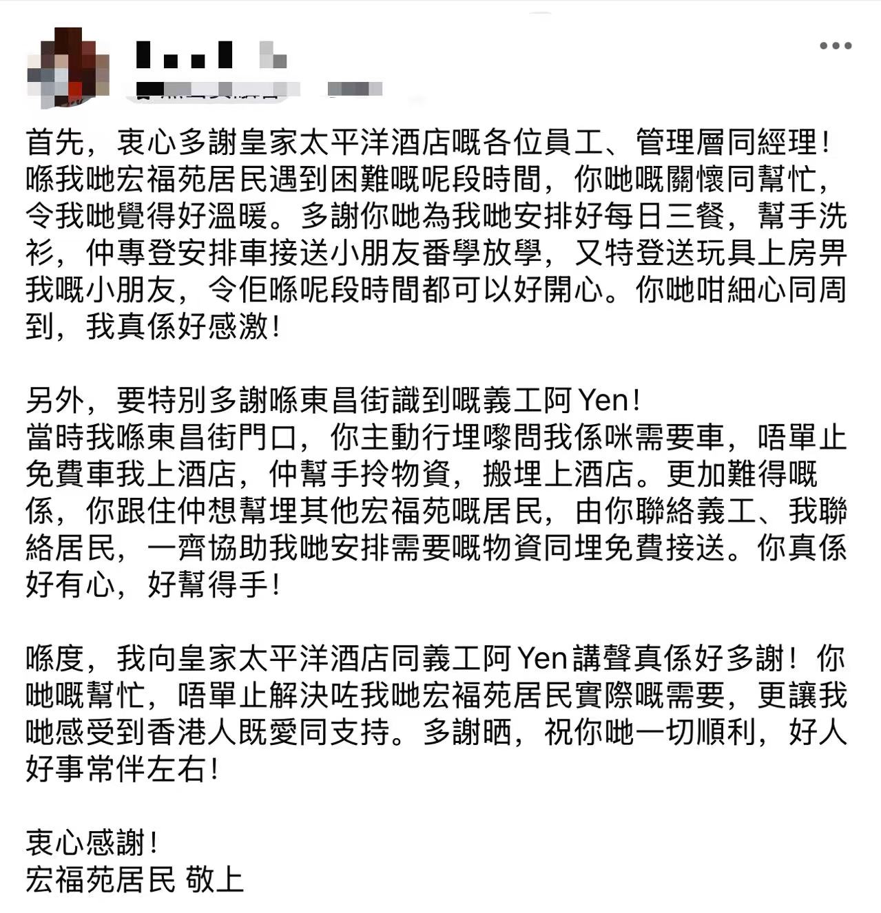 12月1日深夜,有一名獲安排入住皇家太平洋酒店的受影響居民在社交平台發文感謝在這段時間提供幫助的酒店員工及義工,表示在社會各界愛心人士的幫助下,不僅解決了宏褔苑受影響居民的實際需要,更讓人感受到香港人的愛和支持。