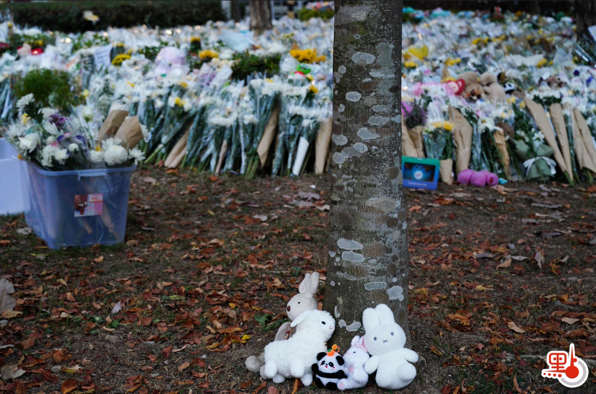 在一束束白菊旁,悄悄出現了毛絨小羊、小兔子等安撫玩偶,令人鼻酸。