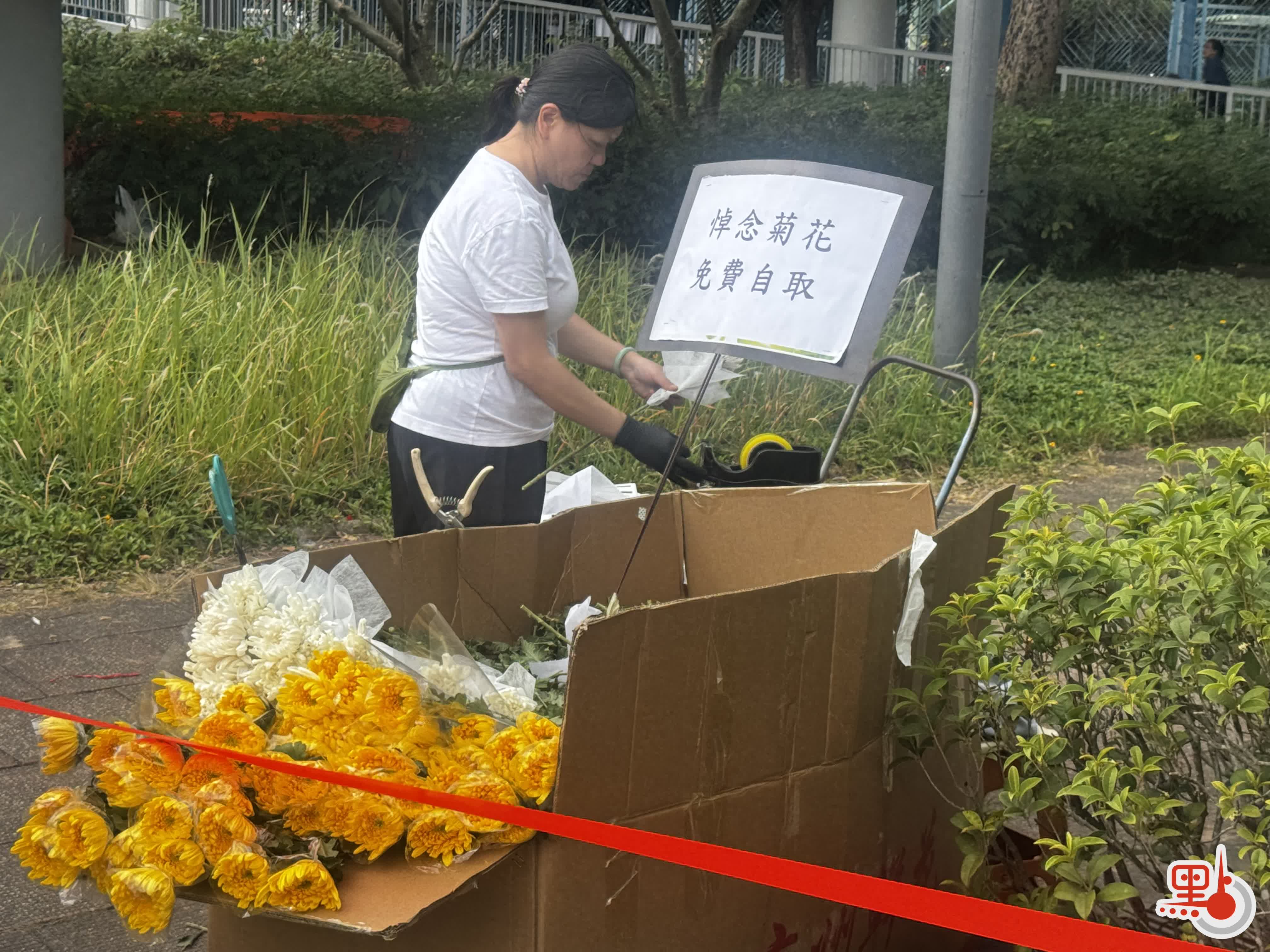 點新聞記者在現場遇到一位劉先生。他手持鮮花,面朝宏福苑的方向雙手合十、多次鞠躬,口中念「希望你安息」等話語。隨後,劉先生拿起筆寫下一張卡片:「阿姨(姨媽),多謝你對我由細照顧至大。」寫完後,他一時失神,不知該將卡片擺放在何處。記者幫他接過卡片,並按其意願,小心翼翼地粘貼到一個他認為穩妥的位置,「我希望阿姨睇得到」。