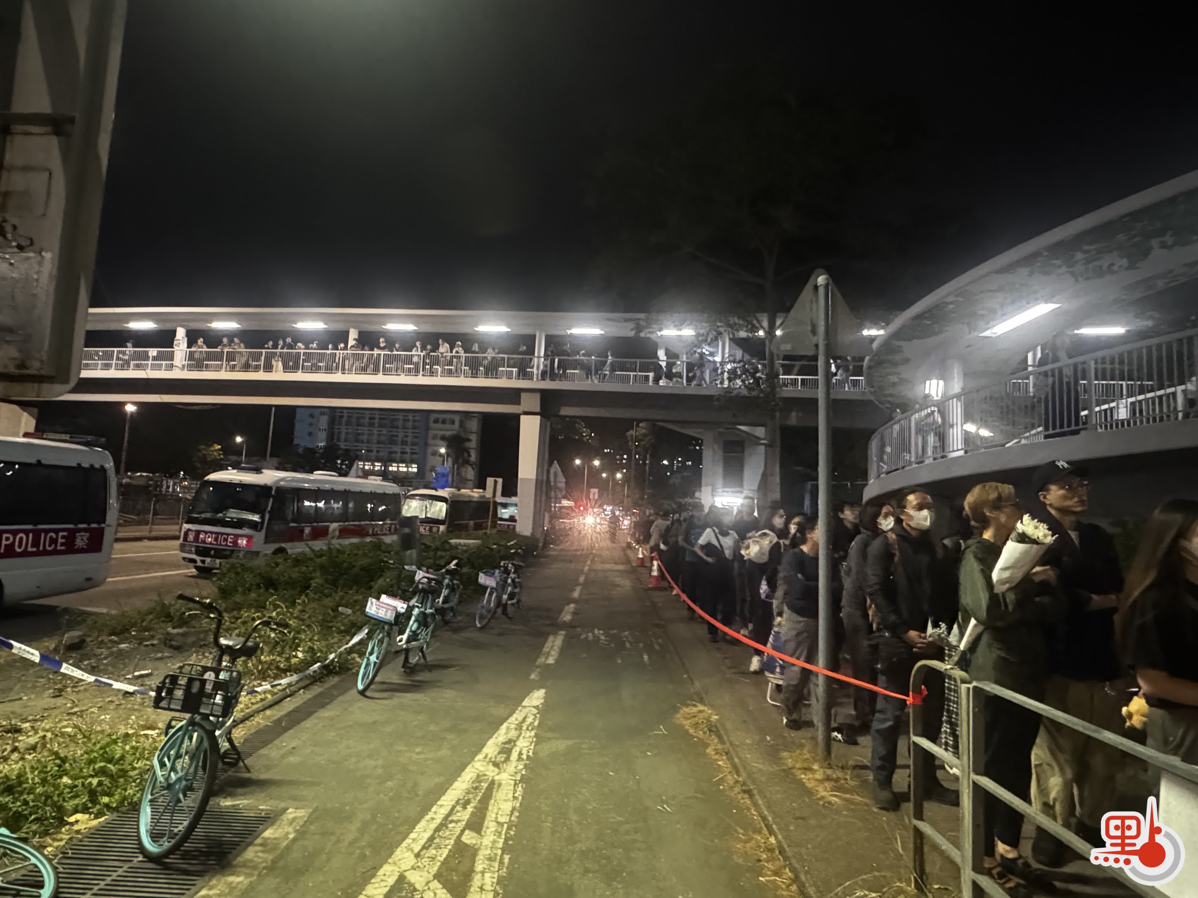 【點新聞報道】宏福苑五級大火發生至今已一周,今日(12月2日)正值罹難者的「頭七」。入夜後,前往宏福苑附近悼念的市民有增無減。晚上7時過後,從大埔墟港鐵站開始,沿路至宏福苑樓下,排起了長長的人龍。人們捧着花束,天橋上、河邊都站滿了人。