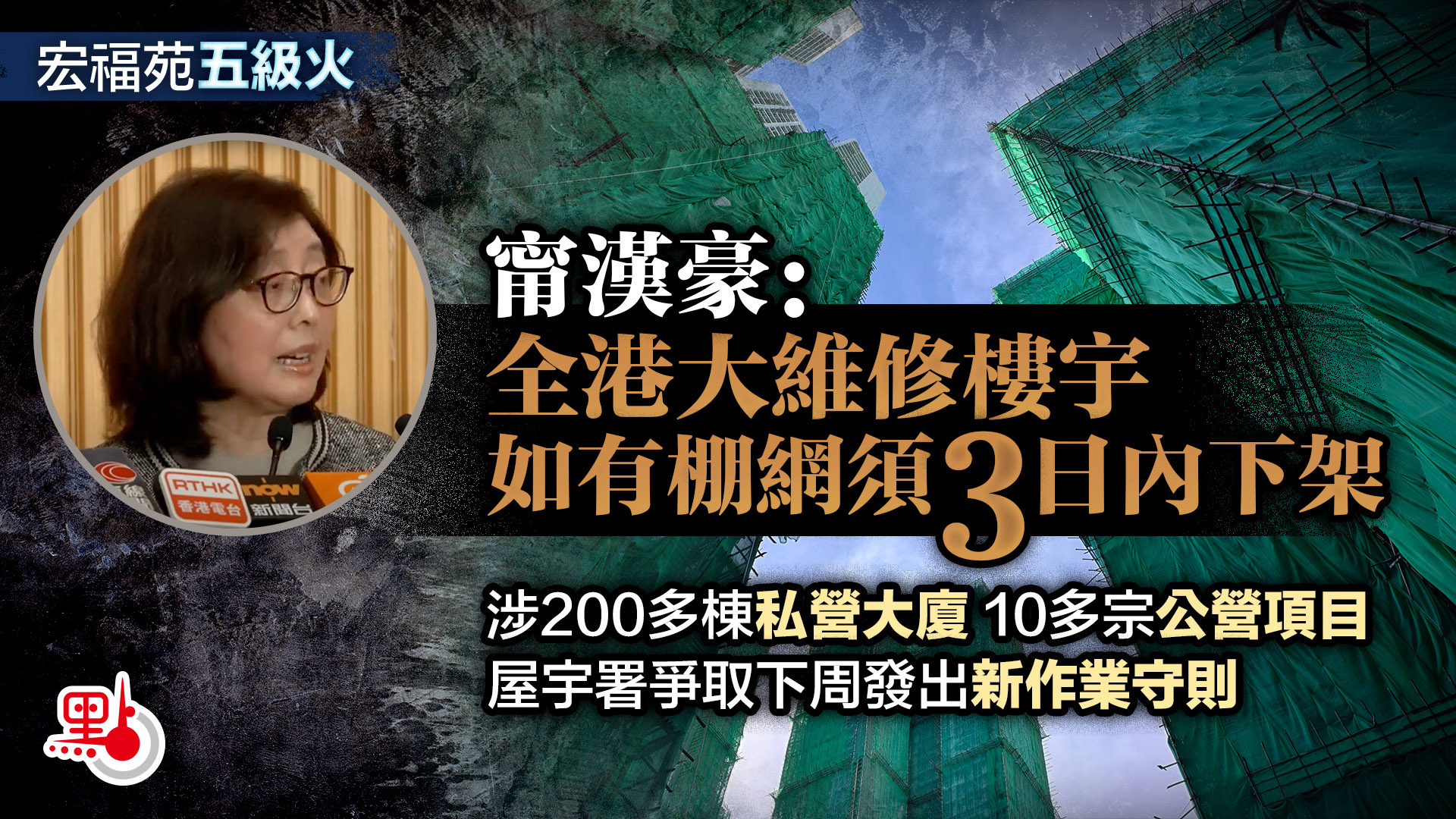 (有片)宏福苑五級火|全港大維修樓宇棚網須3日內下架 下周推新守則 棚網抵達就地採樣