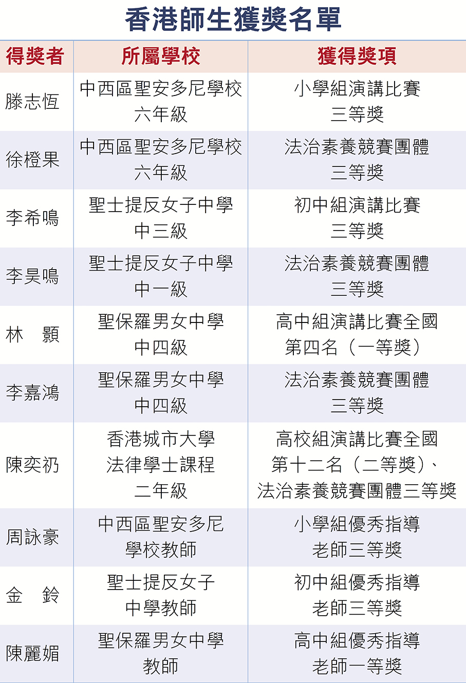 在演講比賽中,中西區聖安多尼學校六年級學生滕志恆獲小學組演講比賽三等獎,聖士提反女子中學中三級學生李希鳴獲初中組三等獎,聖保羅男女中學中四級學生林顥獲得高中組全國第四名(一等獎),陳奕礽則收穫了高校組全國第十二名(二等獎),還受邀參加2025年國家憲法日教育系統 「憲法晨讀」活動。
