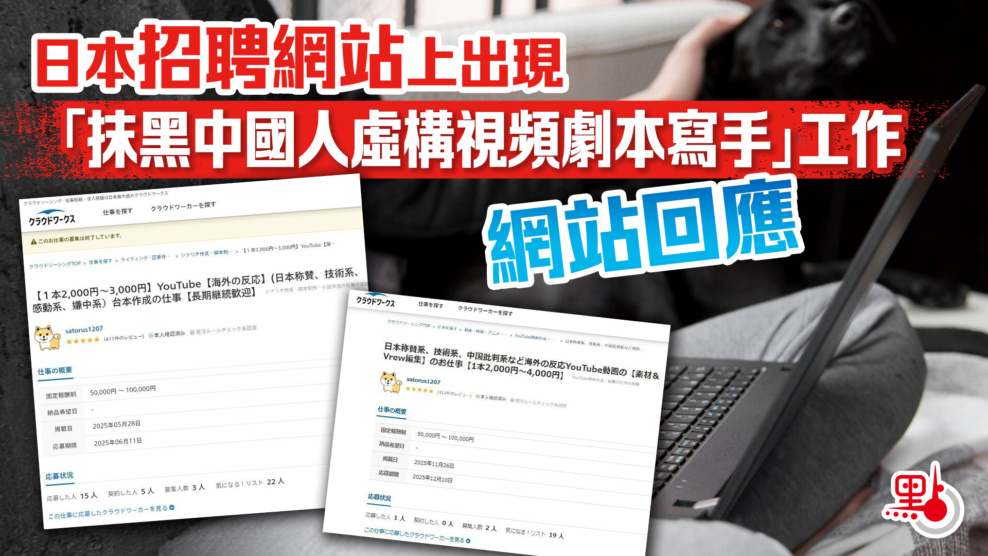 日本招聘網站上出現「抹黑中國人虛構視頻劇本寫手」工作 網站回應