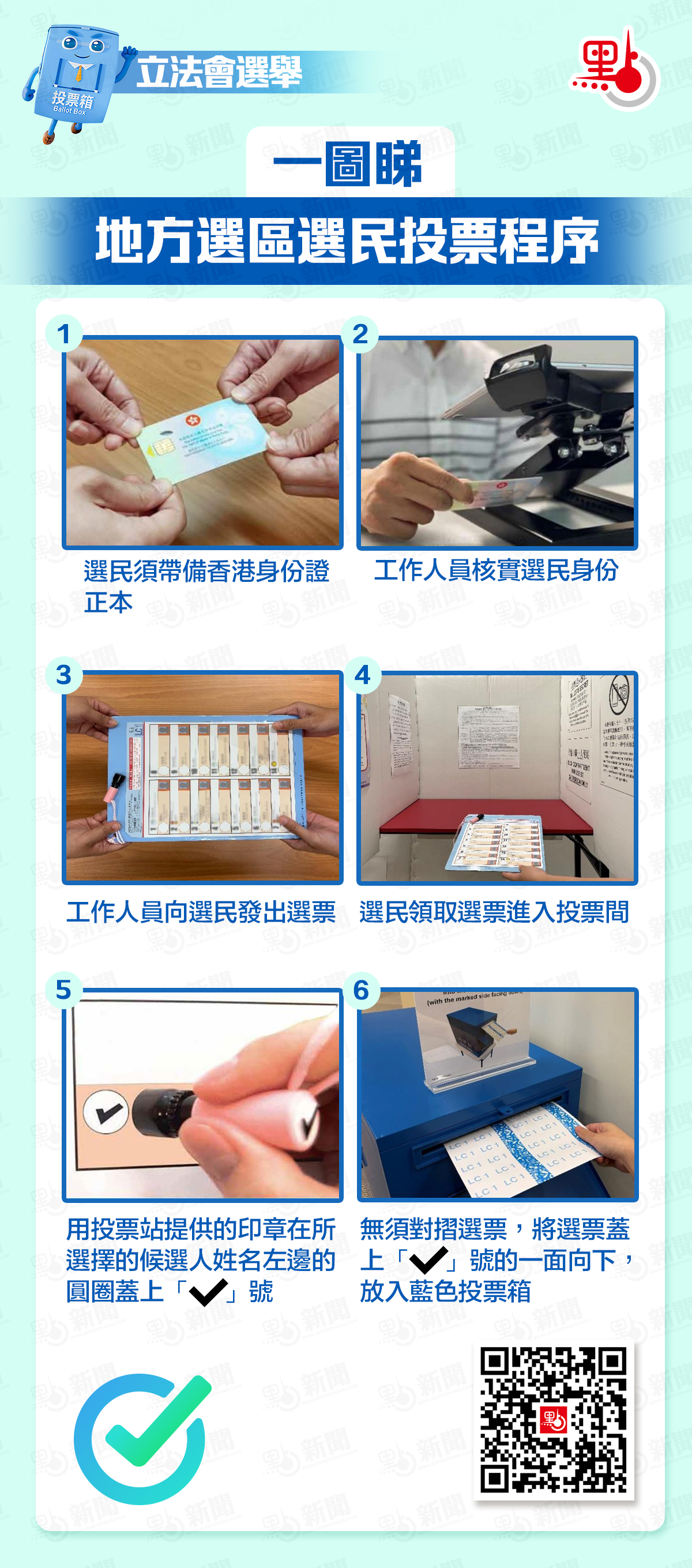 選民須按投票通知卡或經「智方便」得到的資訊,到指定投票站,出示身份證正本,經核實身份獲發選票。有需要人士可使用特別隊伍。