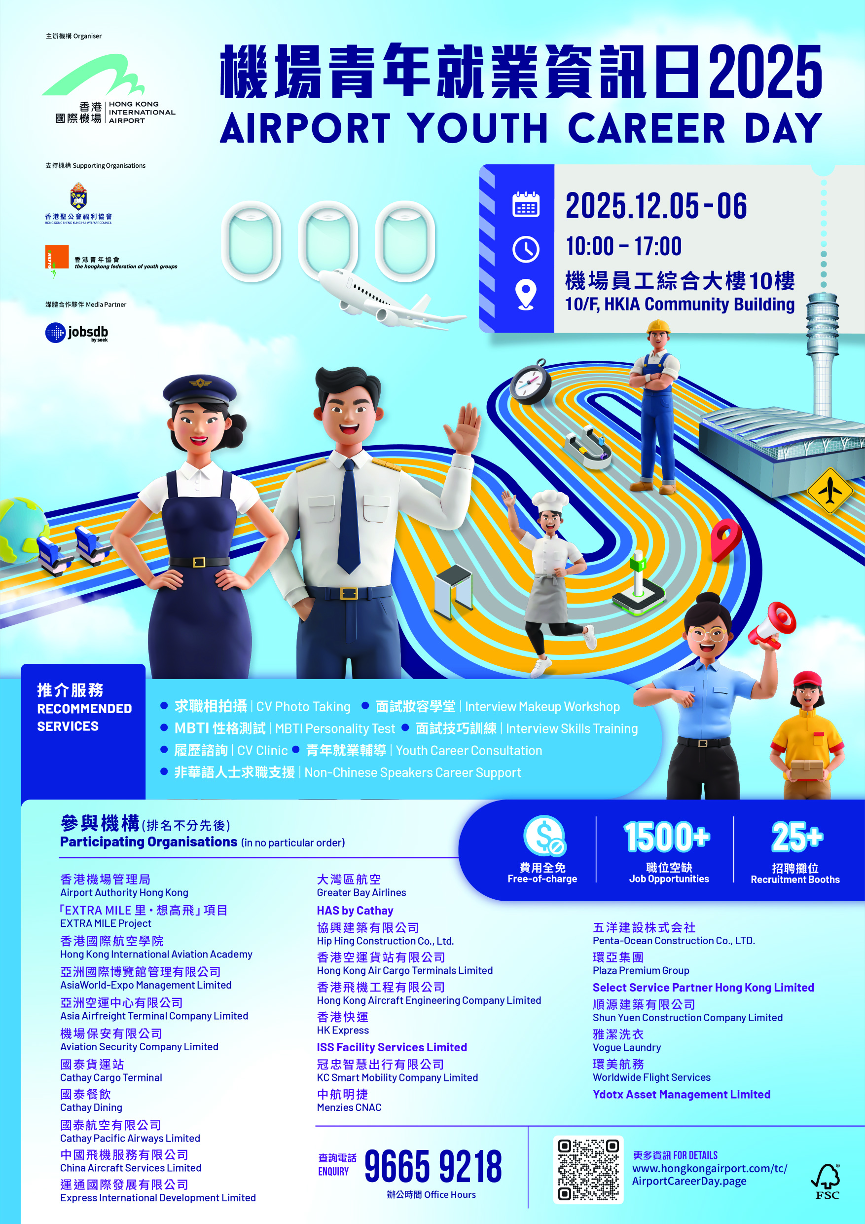 【點新聞報道】機管局今明(5日及6日)兩日舉行「機場青年就業資訊日」,有超過20個機構參與,提供超過1500個職位空缺,參加者可即場面試(點擊瀏覽詳情)。