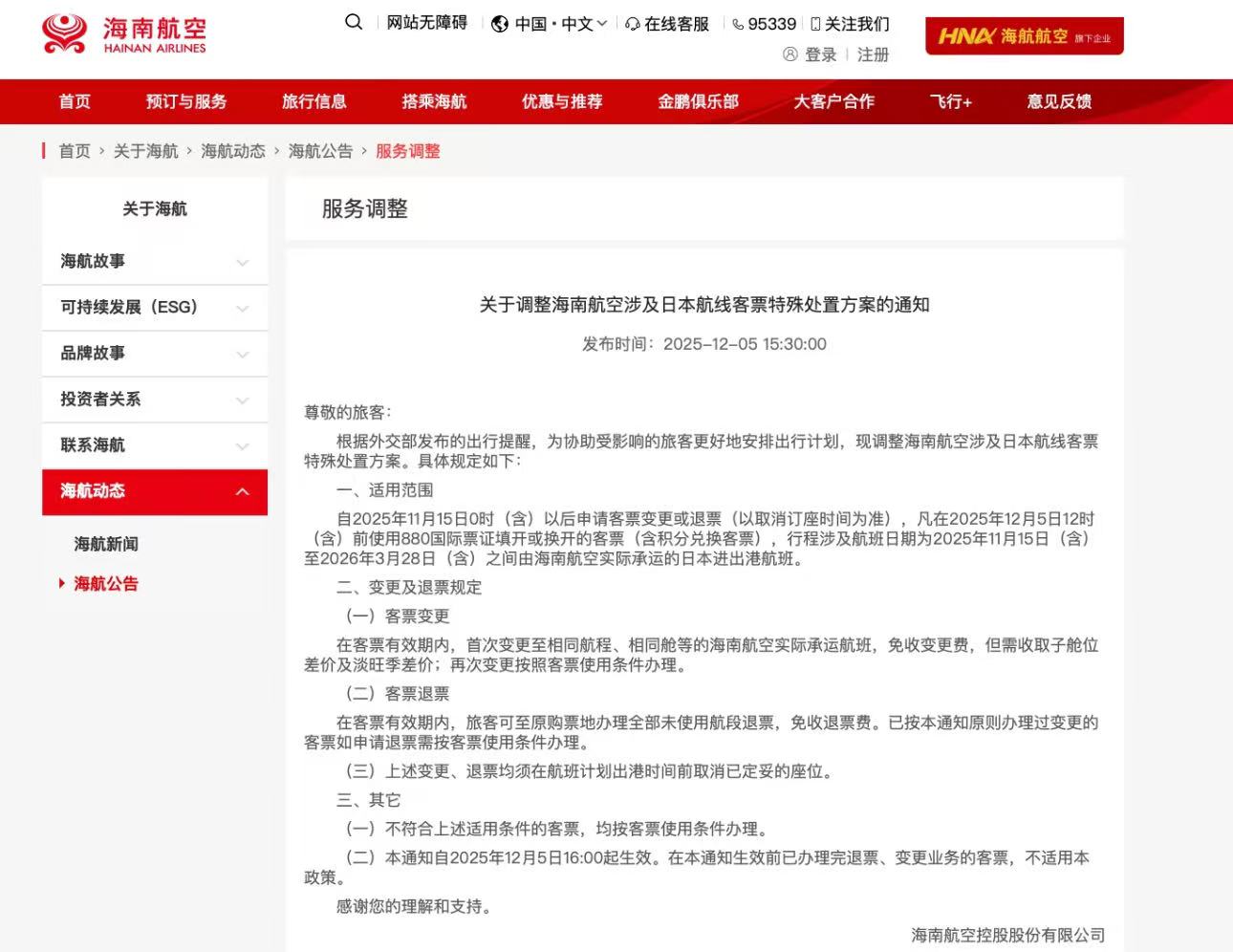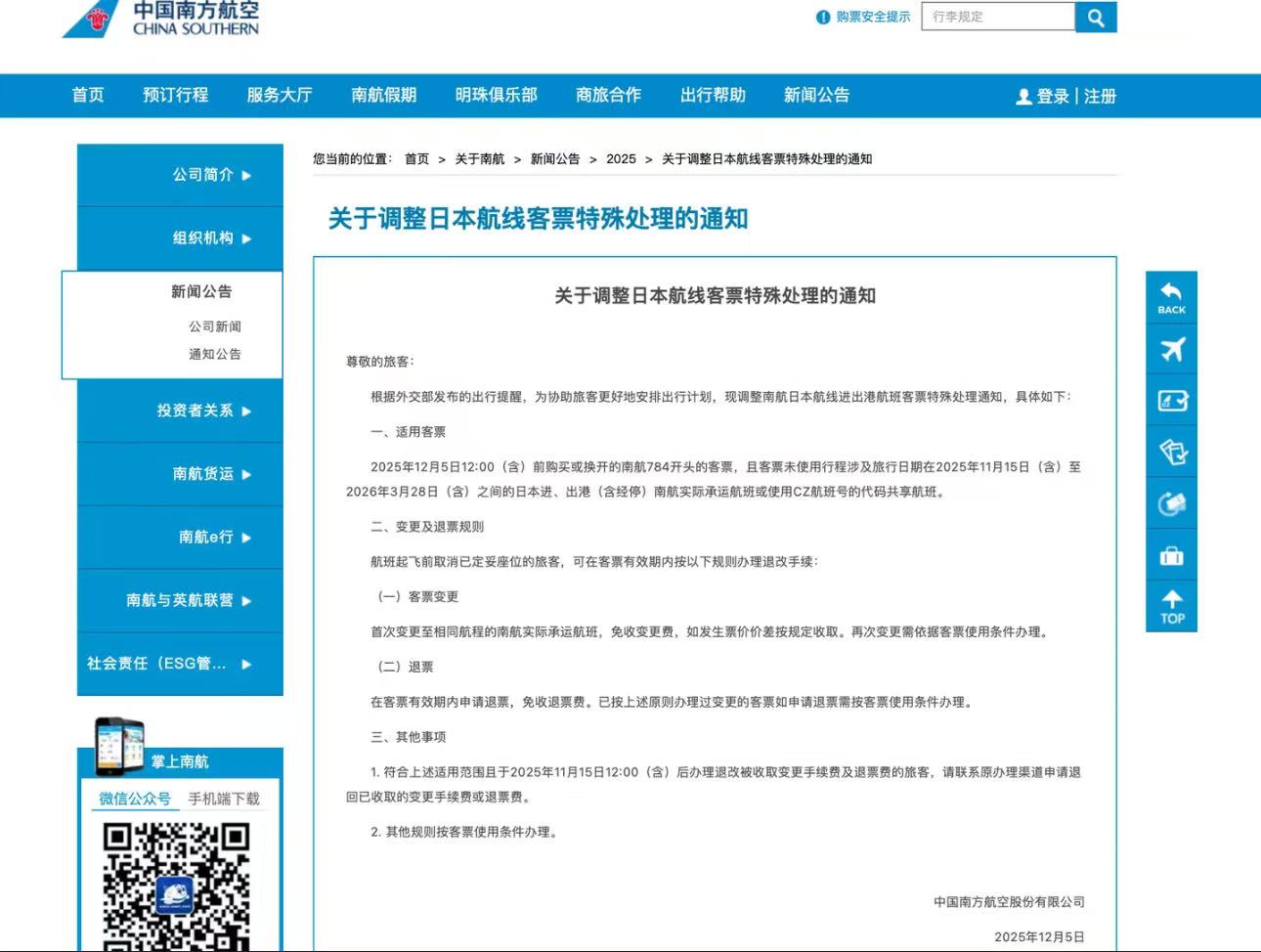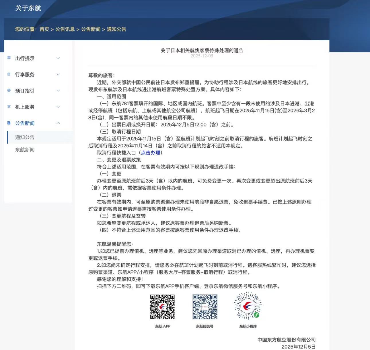 東航表示,為協助行程涉及日本航線的旅客更好地安排出行,現發布東航涉及日本航線進出航班客機機票的特殊處置方案,凡機票中至少含有一段未使用的涉及日本進港、出港或經停航班(包括東航、上航或其他航空公司航班),航班起飛日期在2025年11月15日至2026年3月28日期間的,可免費變更一次,退票則免收退票手續費。