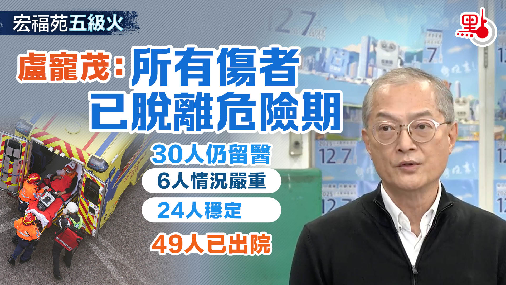 就大埔宏福苑五級大火事件,醫務衞生局局長盧寵茂見傳媒時表示,事件發生當日,除了4名居民送院不治,共有79人接受治療。現時全部79位傷者脫離危險期,當中49人已經出院,有30人仍然留醫,當中6位傷者情況嚴重,24位傷者穩定。