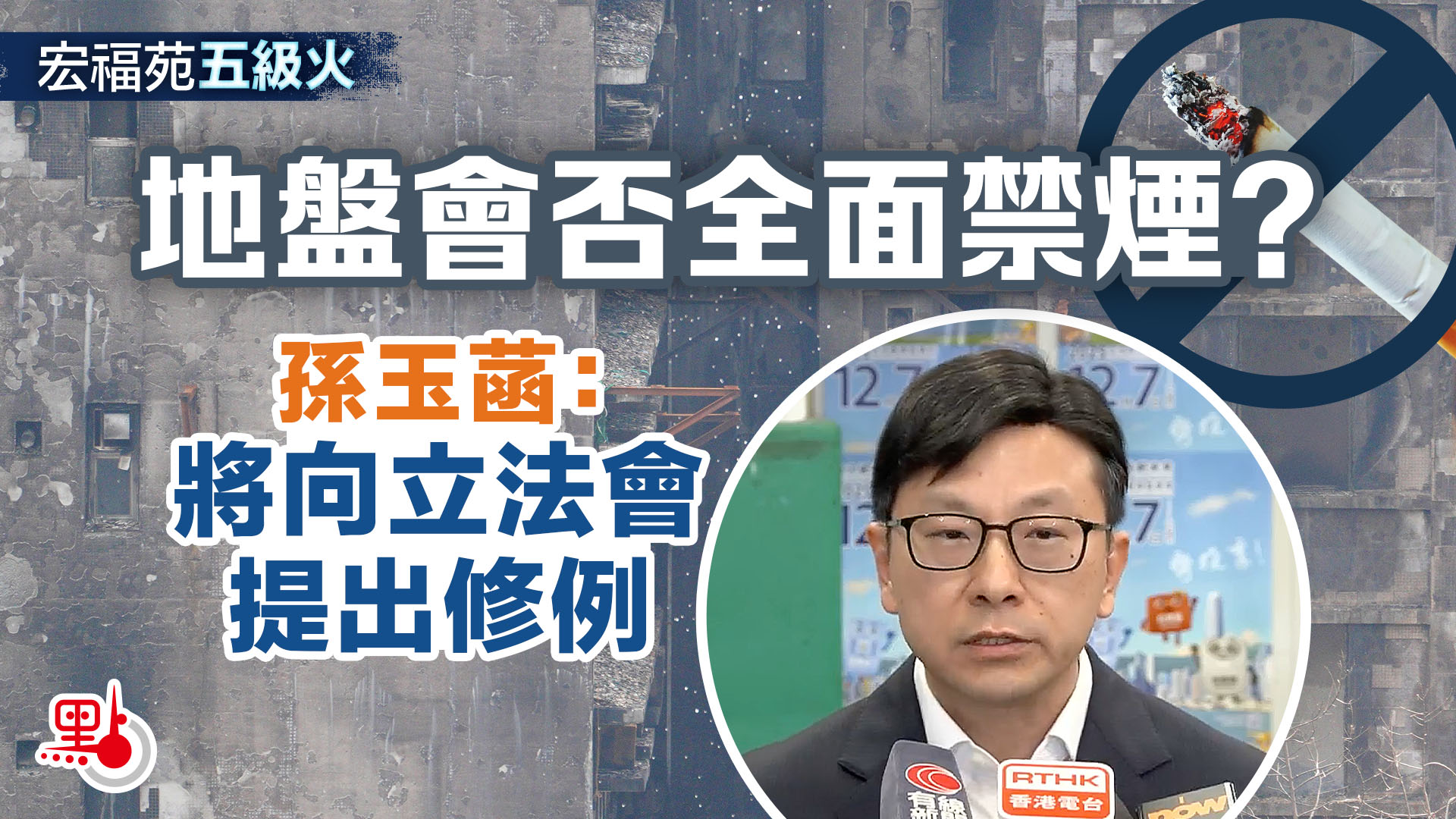 宏福苑11月26日發生五級大火,輿論除了關注發泡膠及棚網等材料,亦關注地盤吸煙問題。勞工及福利局局長孫玉菡回應指,依照現時法例,若勞工處在巡查時發現地盤有火災風險,可以將地盤劃定為禁煙區。當局亦留意到現時有關地盤全面禁煙的呼聲,因此在新一屆立法會依法產生後,會立即向立法會提出地盤全面禁煙的問題。若獲得多數議員支持,當局將第一時間修訂法例,並落實地盤全面禁煙。