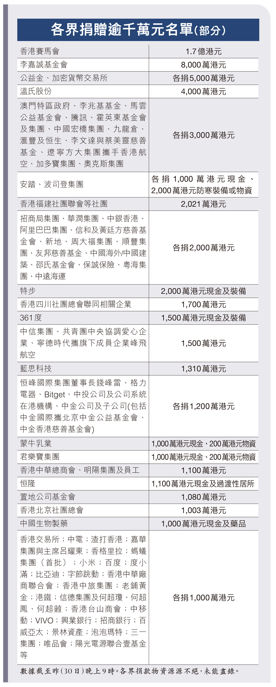 特區政府27日成立「大埔宏福苑援助基金」,並投入3億港元作為啟動資金。截至12月5日中午,援助基金已收到外界捐款27億港元,基金總額約為30億港元,將用於協助居民重建家園。