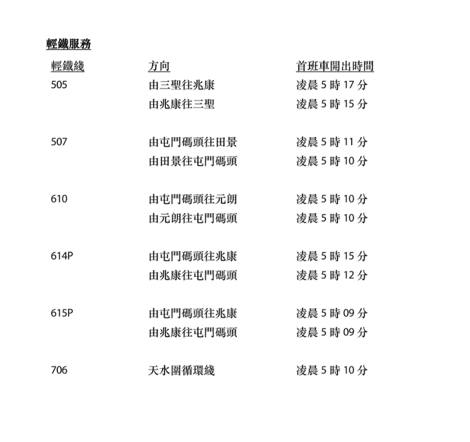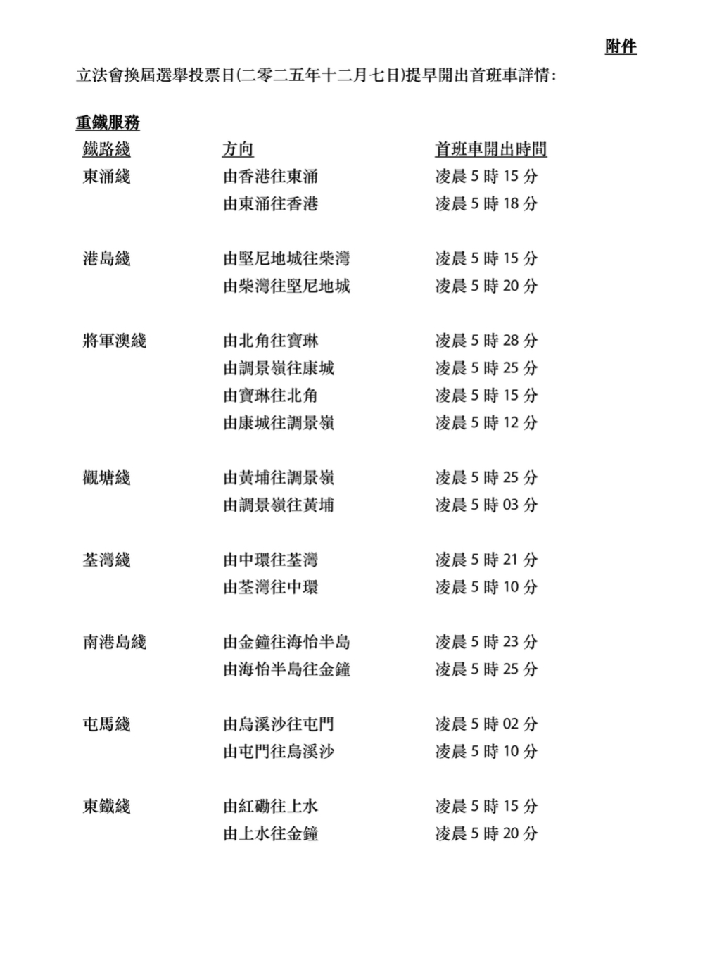 【點新聞報道】香港第八屆立法會選舉將於明日(7日)舉行。為配合選舉日,港鐵發布通告,指大部分綫路會於明日早上提早開出頭班車,以便票站人員前往票站作準備,並呼籲大家齊投票。以下為車次時刻表: