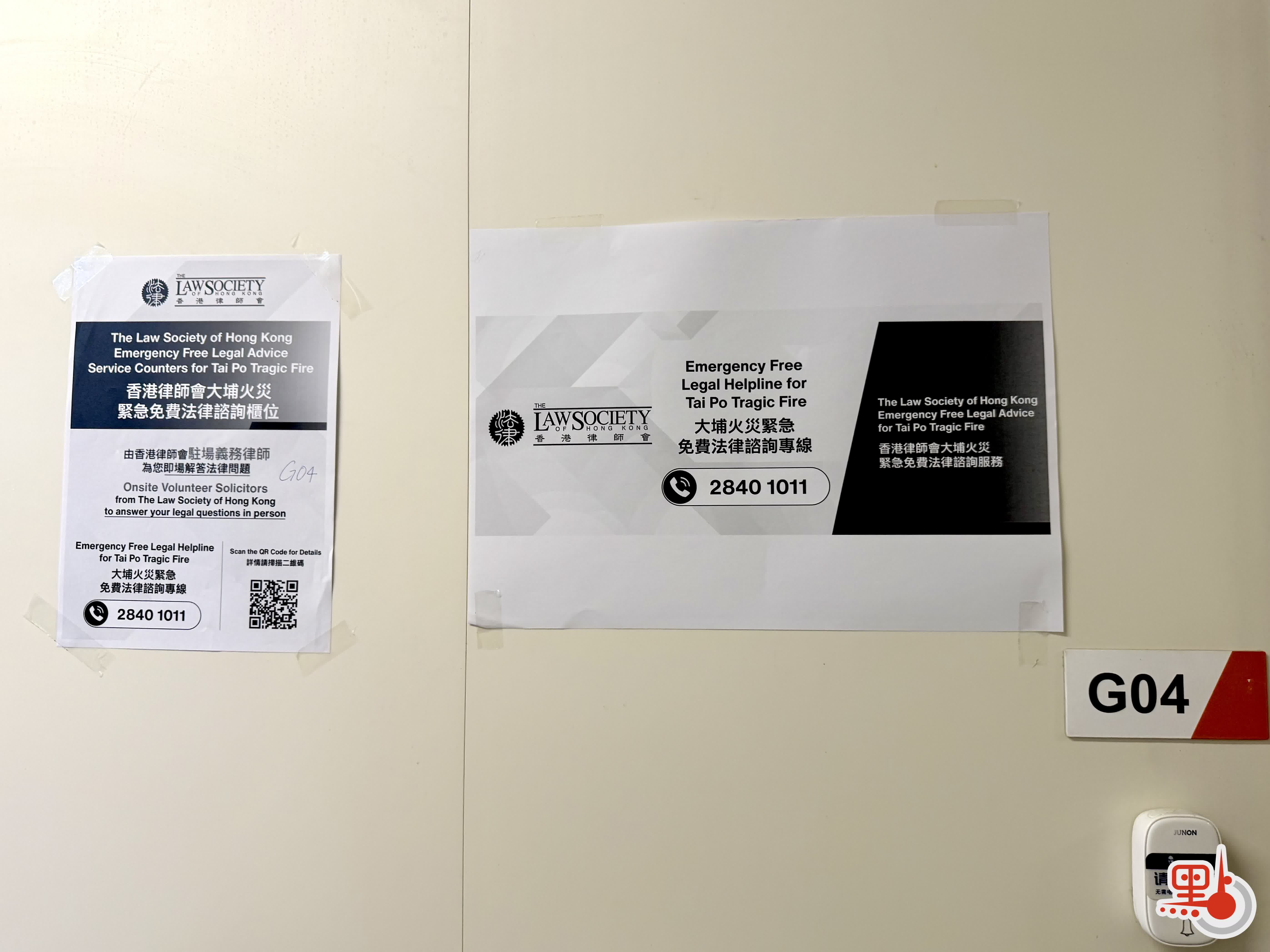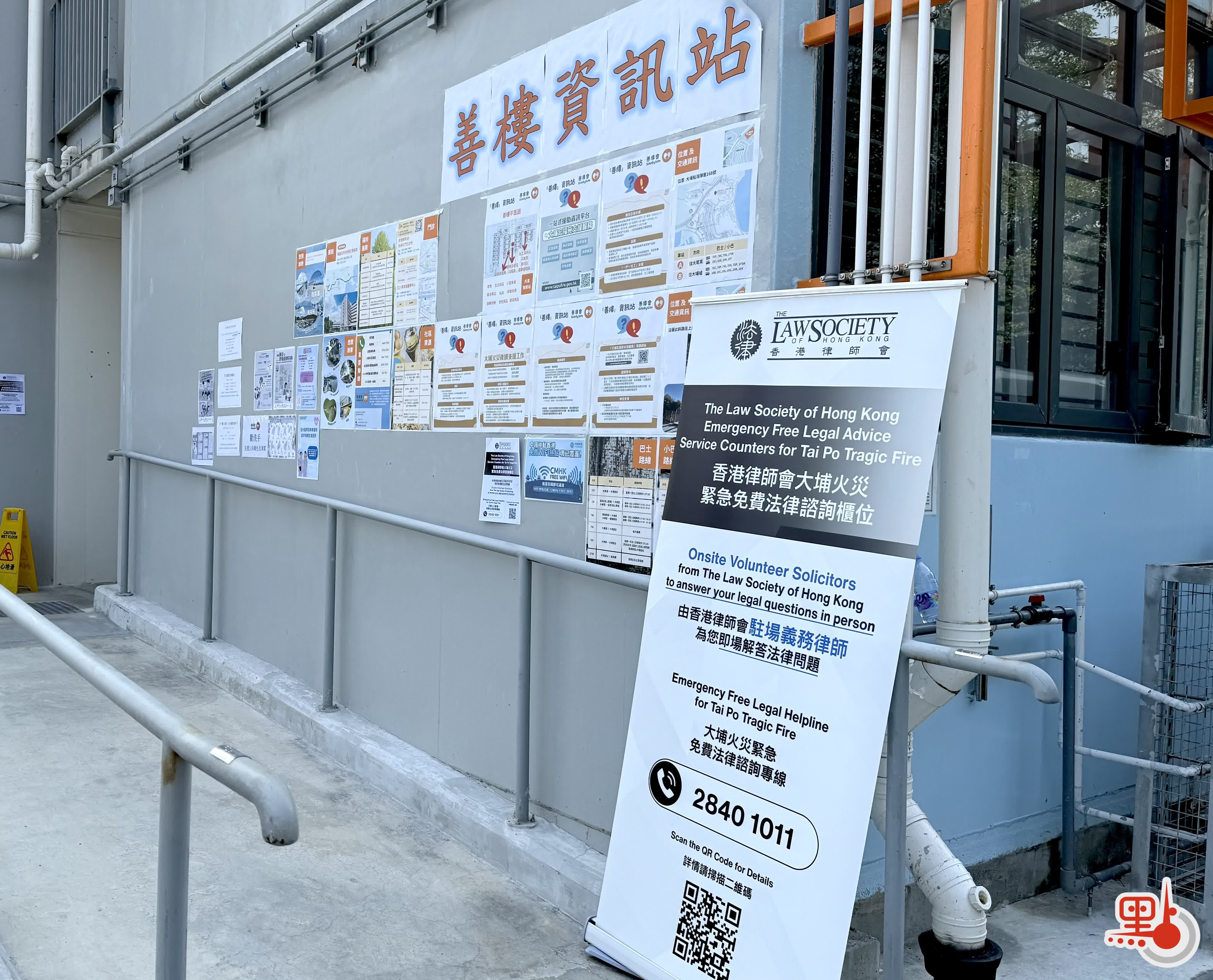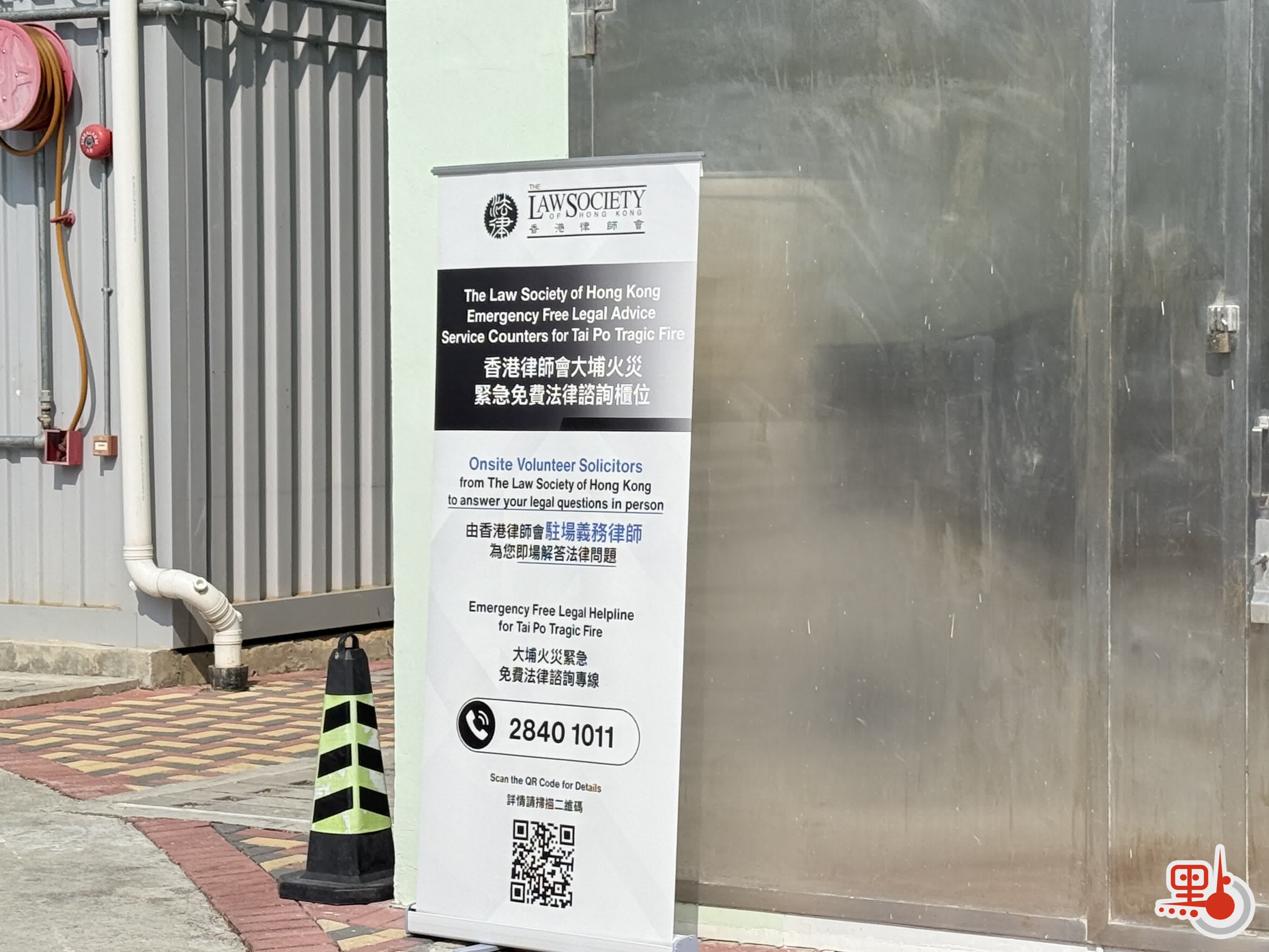 點新聞記者現場所見,位於大埔船灣陳屋168號的「善樓」房屋外已設有香港律師會免費法律諮詢的立牌及公告,上有中英文雙語信息提示及熱線電話號碼,為有需要人士提供指引。來到指定諮詢室後流程亦很便捷,災民無需出示「災民證」等證明文件,只要登記姓名便可獲得初步法律支援。