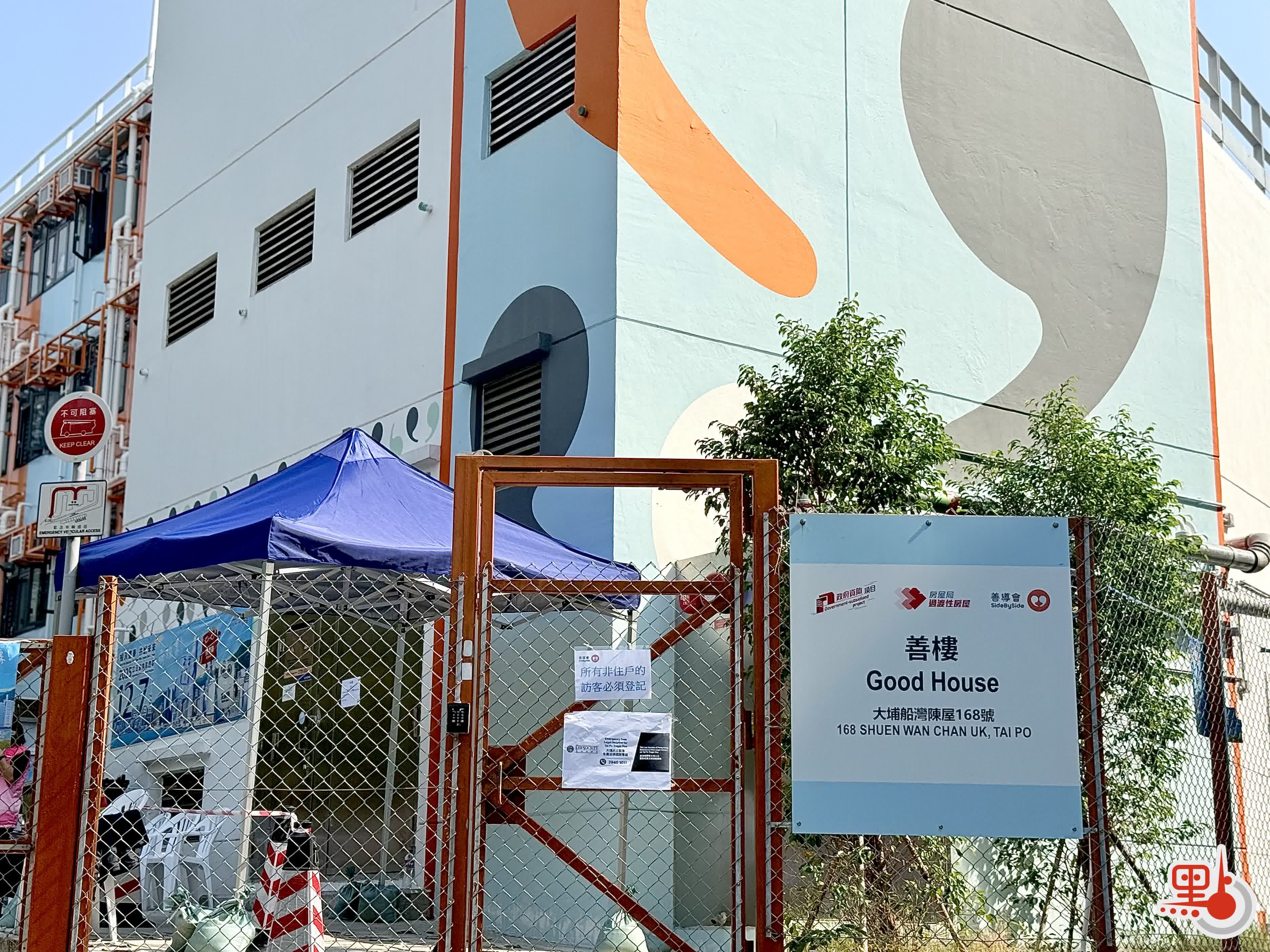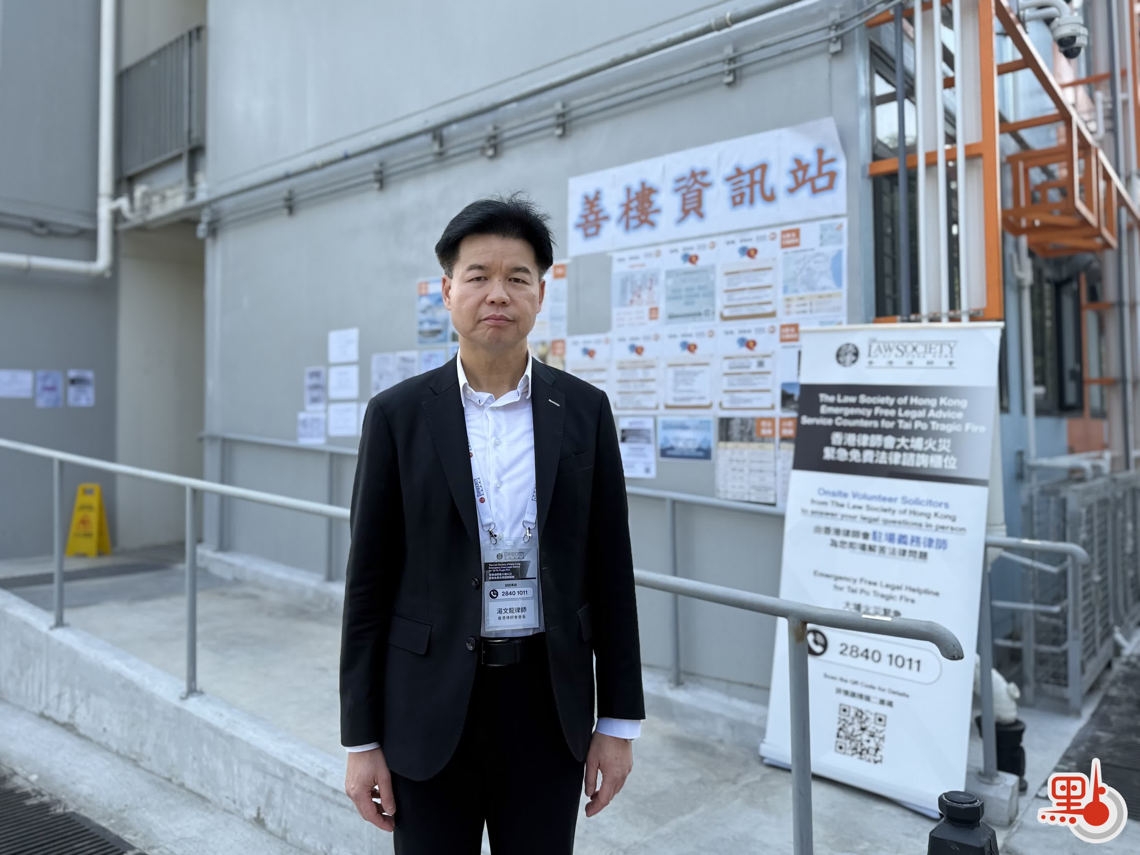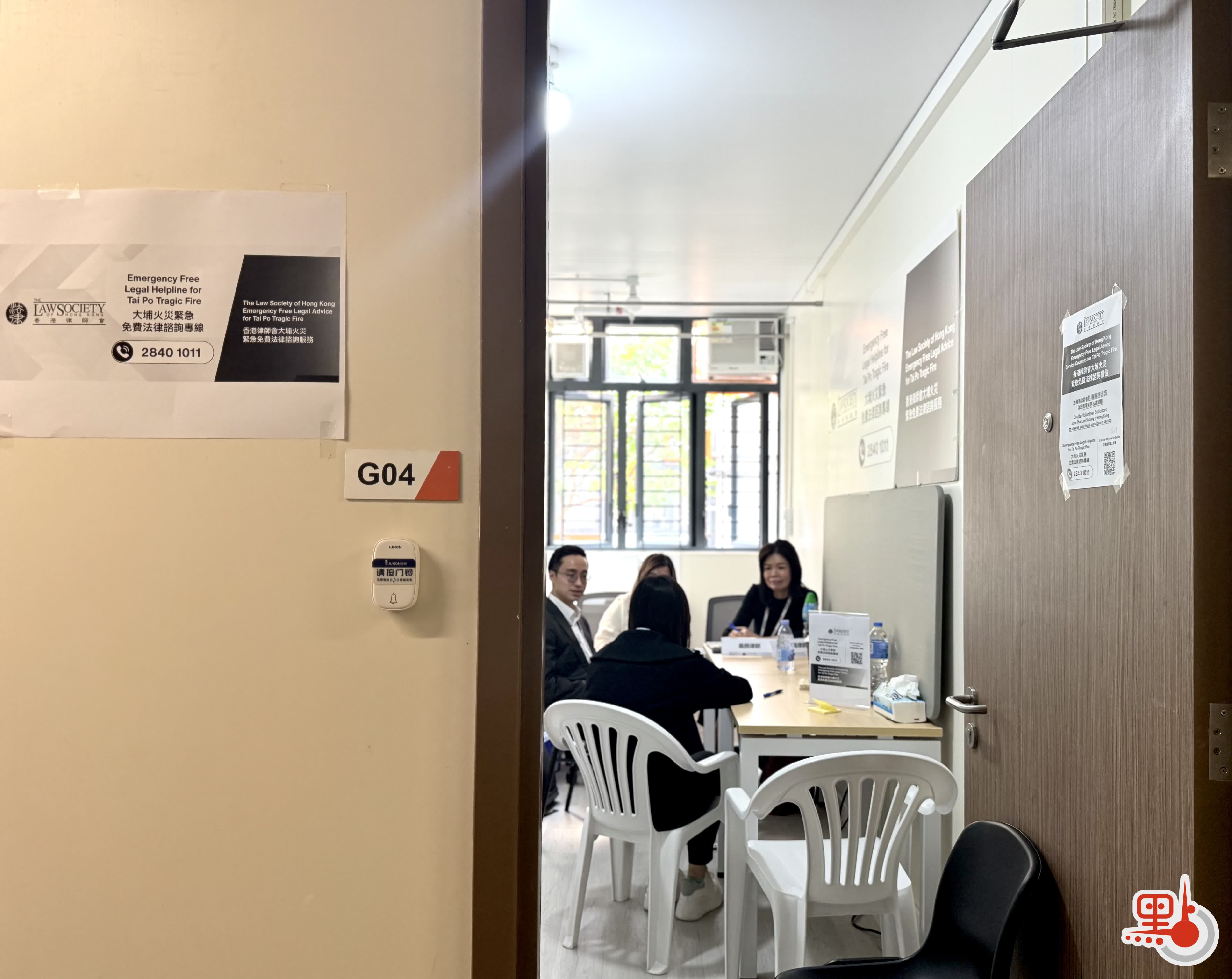 點新聞記者現場所見,位於大埔船灣陳屋168號的「善樓」房屋外已設有香港律師會免費法律諮詢的立牌及公告,上有中英文雙語信息提示及熱線電話號碼,為有需要人士提供指引。來到指定諮詢室後流程亦很便捷,災民無需出示「災民證」等證明文件,只要登記姓名便可獲得初步法律支援。