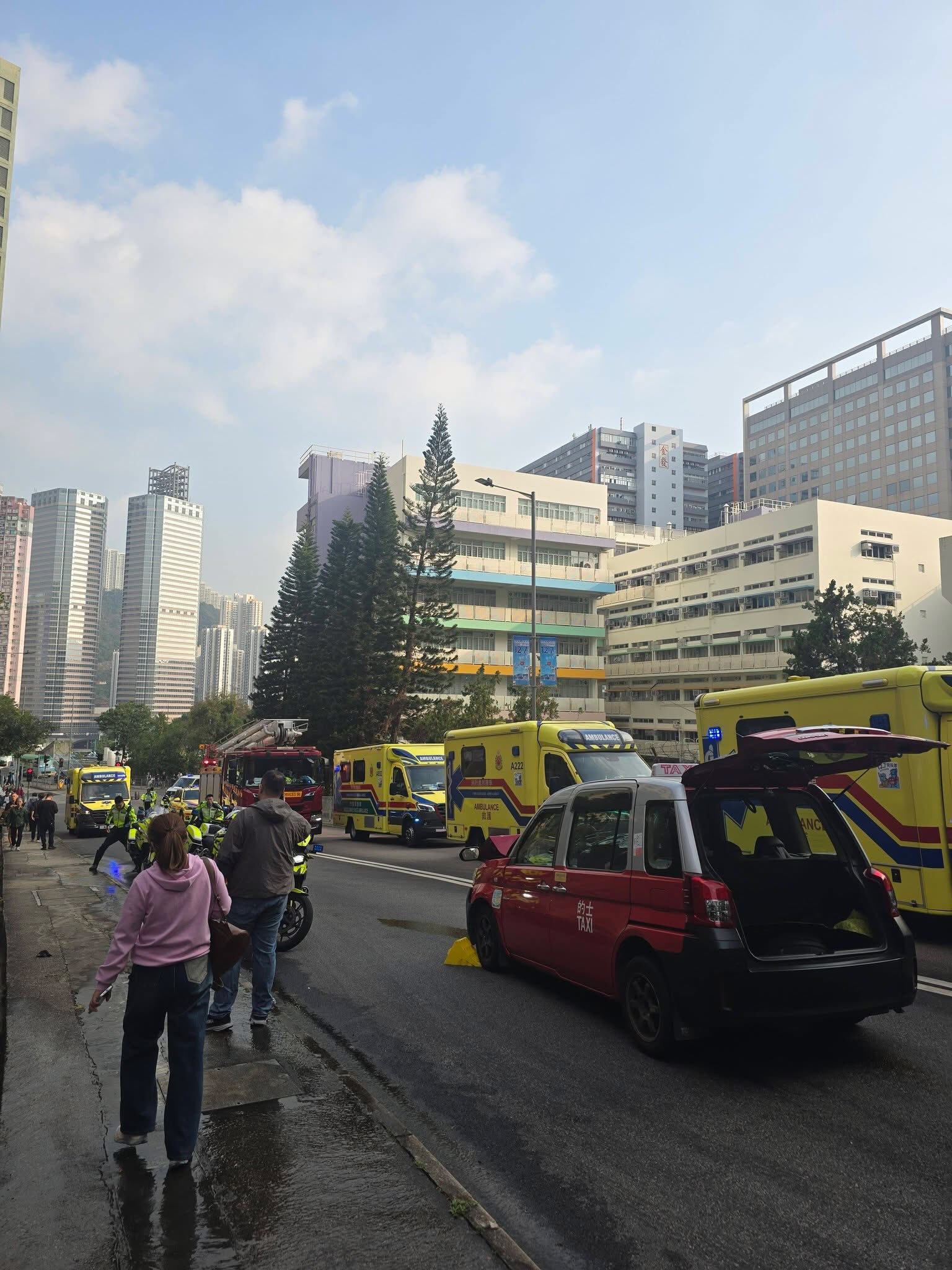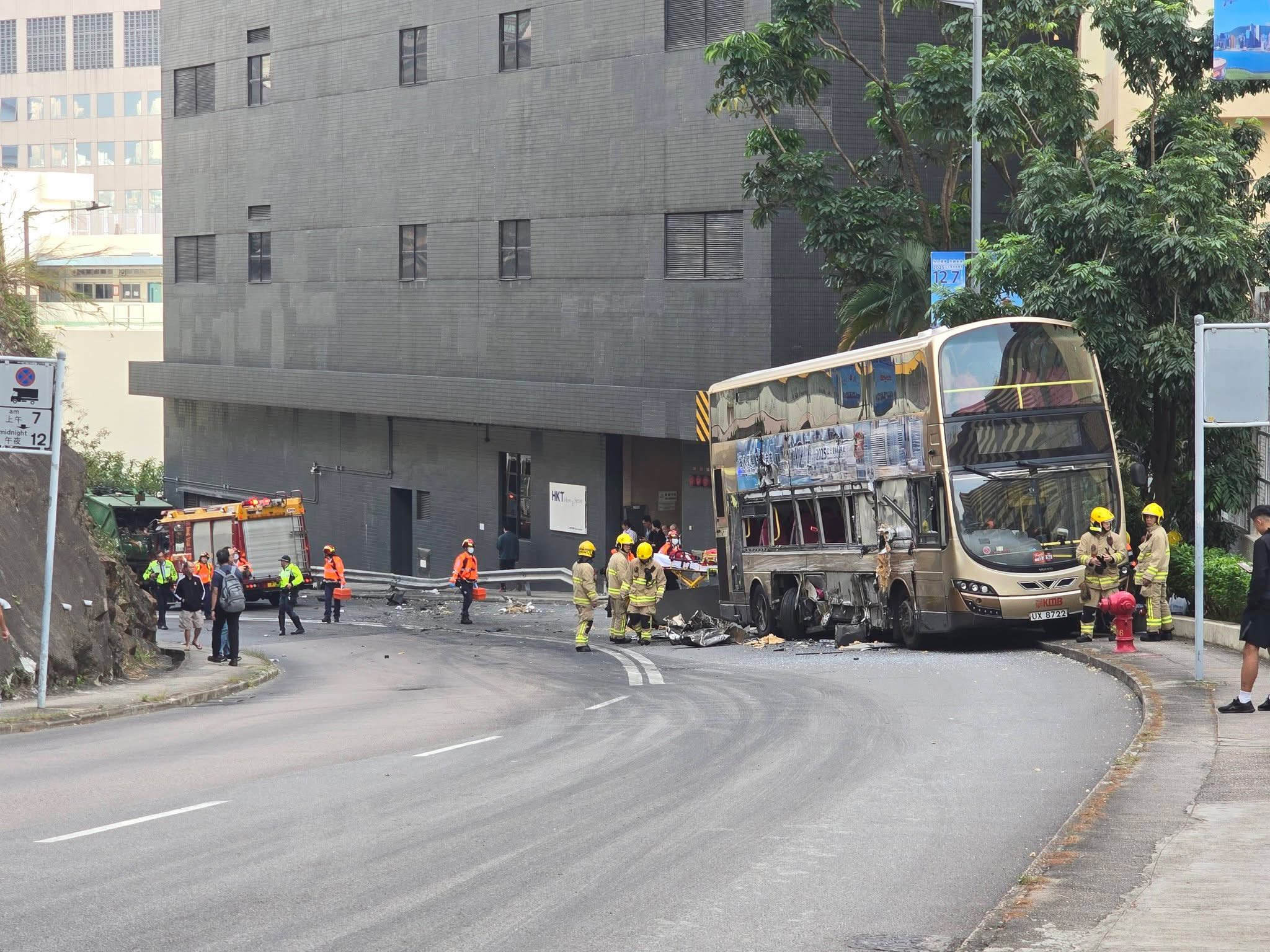 現場畫面可見,一輛巴士衝上人行道,右側車身嚴重刮損,下層玻璃碎裂,部分窗框亦疑似被撞斷。垃圾車則停在逆線,路面留有剎車痕跡;一旁的的士車頭亦被撞至變形。散落的垃圾與汽車零件遍布路面,路邊防撞欄也被撞倒。