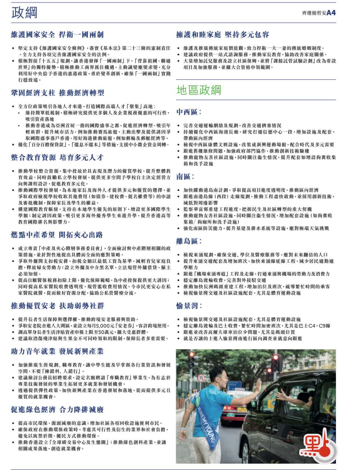 1號候選人楊哲安,代表自由黨出戰港島西選區,現任中西區區議員。政綱方面,他分為中西區、南區、離島區及愉景灣。其中交通部分,包括完善交通運輸網絡及規劃,改善中西區擁堵情況;跟進南港島綫(西段)走線規劃;提升東涌交通配套及增加班次;加密離島渡輪及巴士班次等。經濟部分,楊哲安支持吸引全球人才來港,積極研究個人及企業稅務優惠的可行性;提供誘因吸引國際盛事落戶香港,推賽馬旅遊、郵輪旅遊等。青年發展方面,楊哲安提倡推廣生涯規劃、職專教育,讓學生及早掌握各行業發展空間;加快新興產業在港落地發展,以提供優質就業機會。