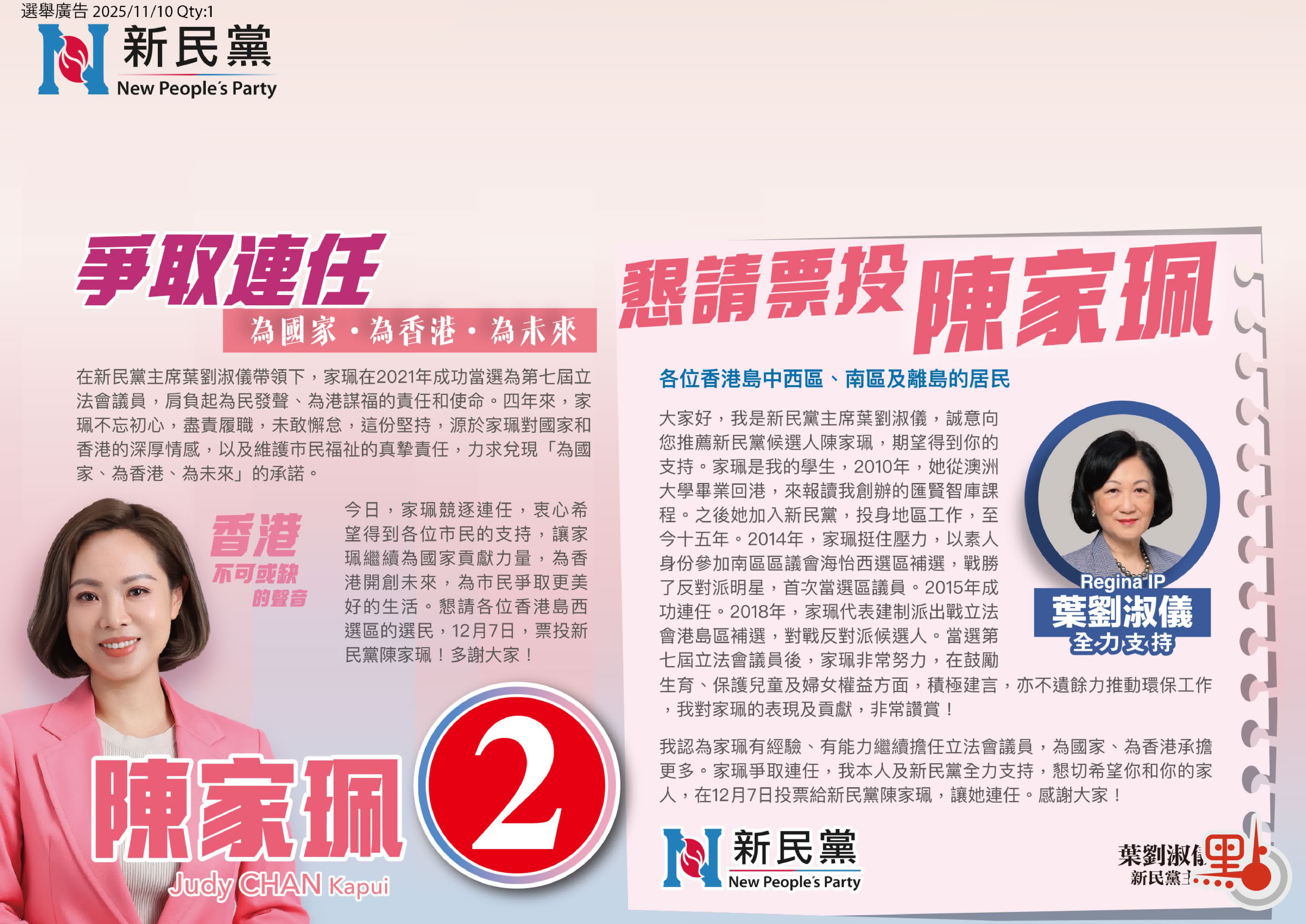 意欲接棒葉劉淑儀的2號候選人、新民黨陳家珮,本屆由選委界「轉跑道」至地區直選。交通方面,陳家珮促「躍動港島南」加快進度;盡快開展港鐵南港島綫(西段)工程,及香港仔隧道巴士轉乘站的投入服務等。經濟發展方面,她的政綱有三大版塊,包括發展寵物經濟、盛事經濟及旅遊業,力爭招攬更多國際巨星和內地頂流來港開演唱會或見面會,同時吸引國際帆船比賽來港,推動帆船經濟和高端旅遊發展。此外,陳家珮強調「家庭友善 鼓勵生育」,她認為可參考海外經驗為二孩以上家庭提供稅務寬免,並研究放寬未婚人士使用輔助生育技術的限制,以配合現代女性的需求等。