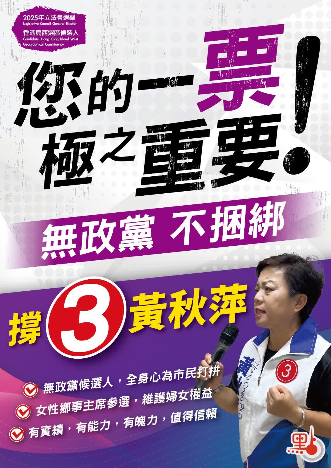 報稱無政治聯繫的黃秋萍,為當區3號候選人。交通方面,黃秋萍爭取興建大嶼山環島公路,繼續推進「兩隧一橋」道路網絡,擴闊嶼南道為標準公路等。經濟發展方面,建議推動海島經濟發展,打造各地旅遊特色,整合各區旅遊資源,挖掘深度遊路線,創造本土經濟、培養本地導賞,提升各區旅遊吸引力。此外,黃秋萍建議維護婦女權益,爭取將三八婦女節定為法定假日;支持「機場城市」建設,鼓勵創科,增加香港競爭力;以及保障本地就業等。