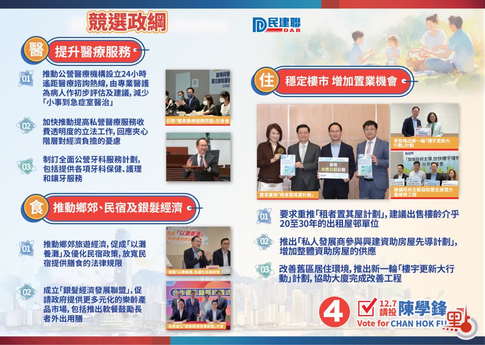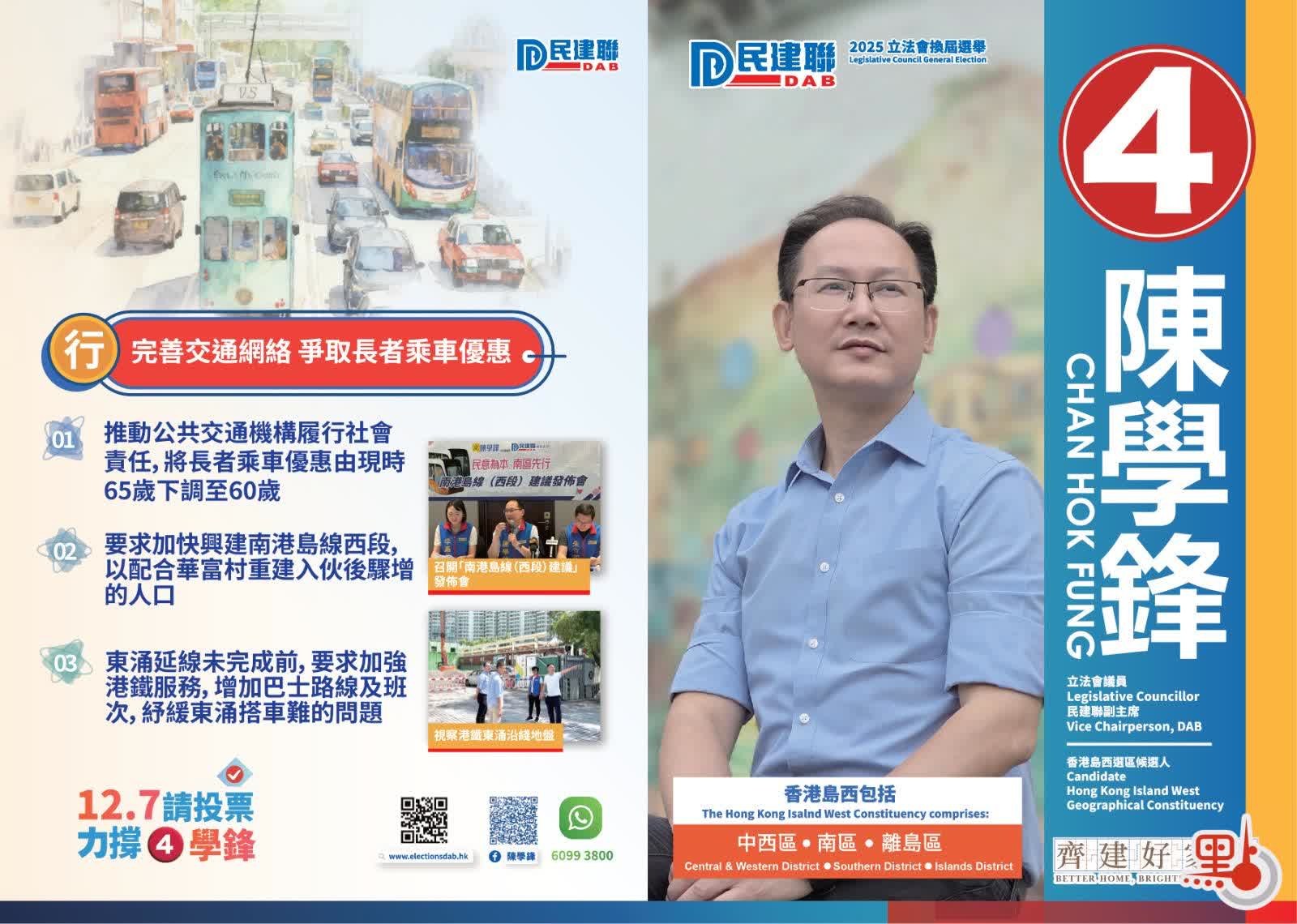 4號候選人,為爭取連任的民建聯副主席、現任立法會議員陳學鋒。他的政綱分為「醫」、「食」、「住」及「行」,交通方面,他倡導推動公共交通機構履行社會責任,將長者乘車優惠年齡下調至60歲;要求加快興建南港島綫西段,配合華富邨重建入伙後驟增的人口;及要求加密東涌站巴士線路及班次。經濟方面,他力推鄉郊旅遊經濟,促「以灘養灘」及優化民宿政策;成立「銀髮經濟發展聯盟」,促請政府提供多元樂齡產品,包括推出軟餐鼓勵長者外出用膳。此外,他亦強調重推「租置計劃」及推「私人發展商參與興建資助房屋先導計劃」,以穩定樓市,增加置業機會等。