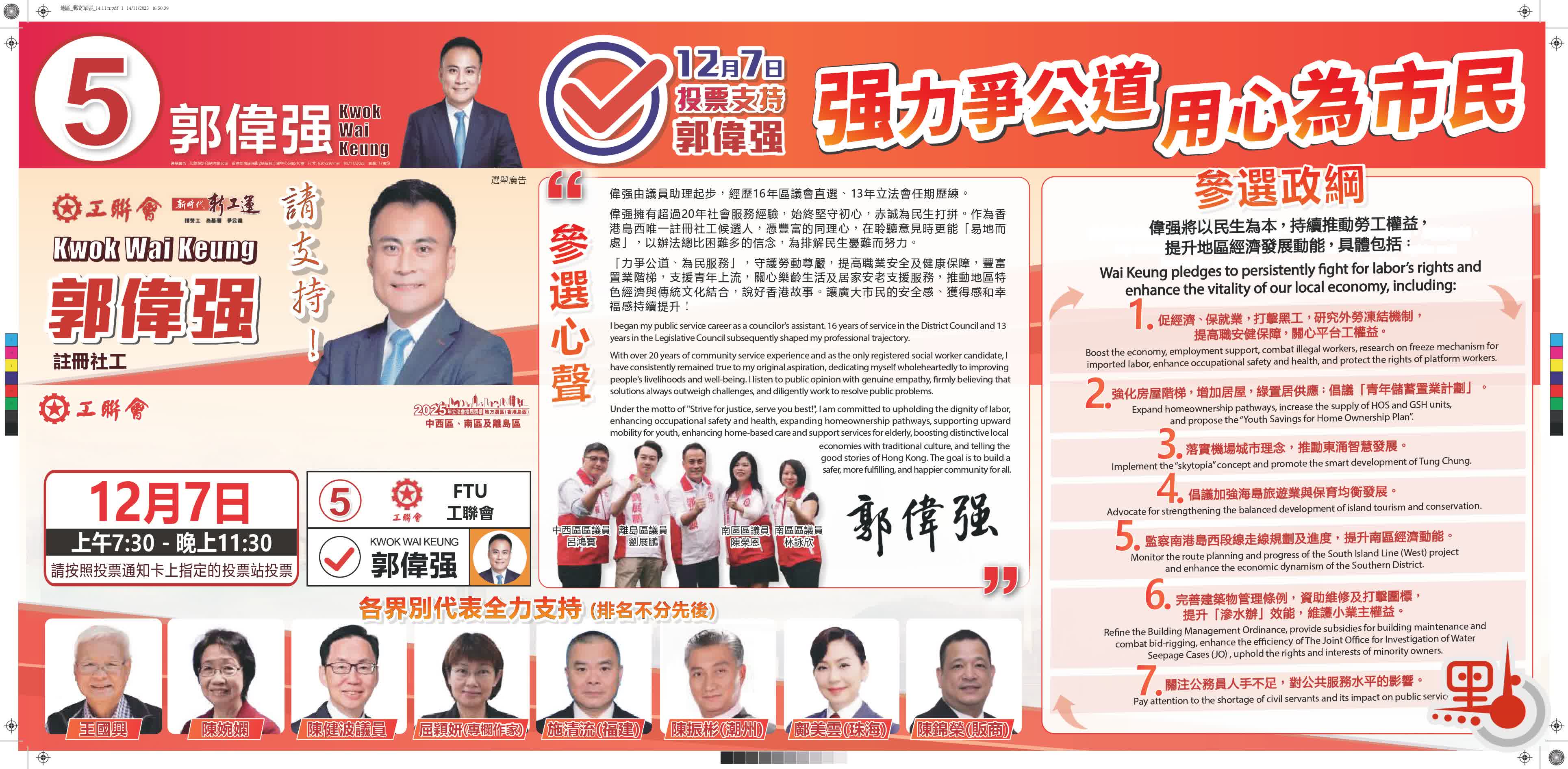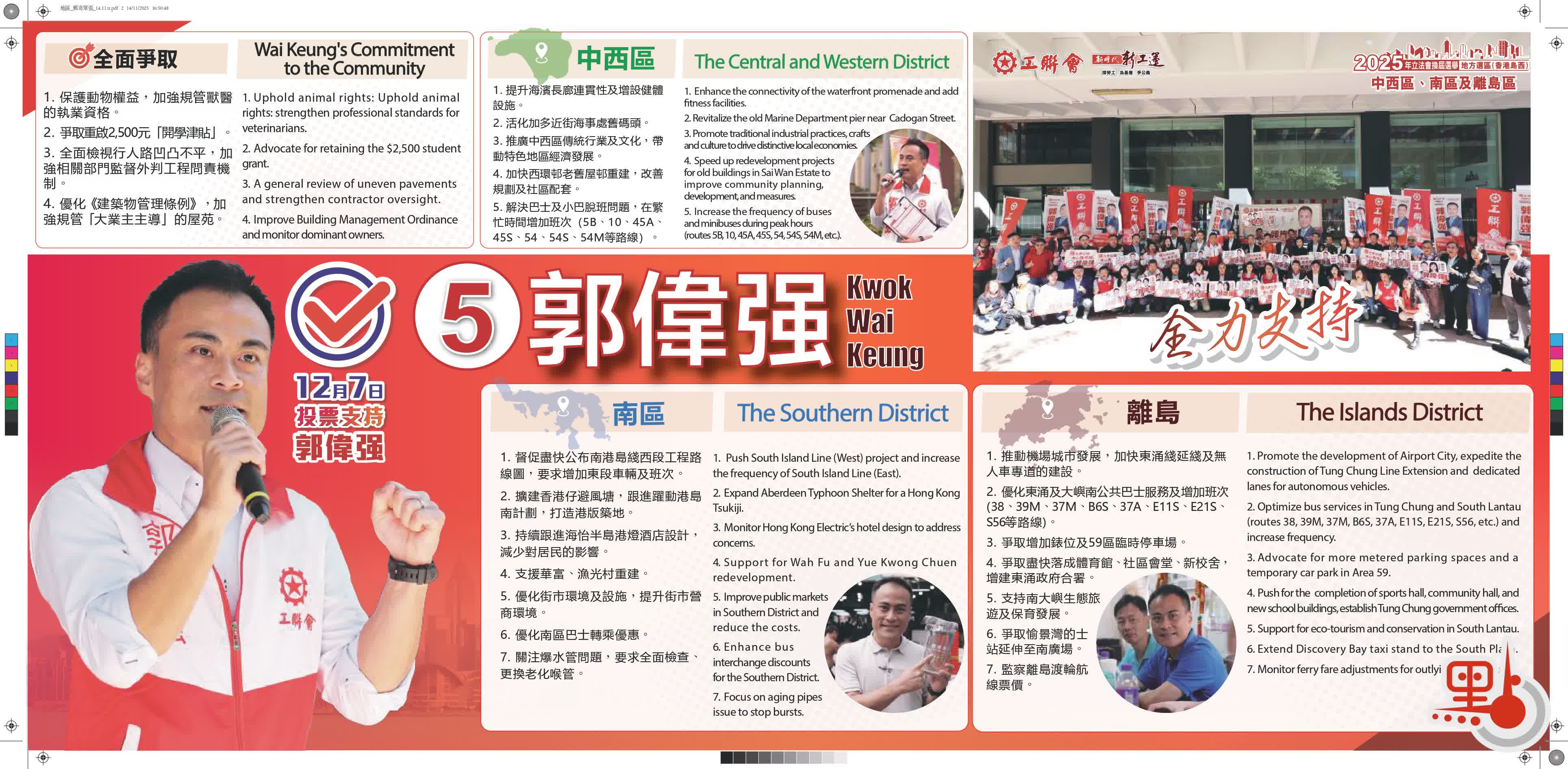 5號候選人,為來自工聯會的現任立法會議員郭偉强,今次由勞工界別轉戰地區直選。交通方面,他力爭解決中西區巴士及小巴脫班問題,在繁忙時間增加班次(5B、10、45A、45S、54、54S、54M等路線);督促盡快公布南港島綫西段工程路線圖;擴建香港仔避風塘,跟進「躍動港島南」計劃等。經濟方面,他強調「促經濟、保就業」,嚴厲打擊黑工,並研究外勞凍結機制;推廣中西區傳統行業及文化,帶動特色地區經濟發展;倡議加強海島旅遊業與保育均衡發展等。至於青年發展方面,他建議提高職業安全及健康保障,豐富置業階梯,支援青年上流,倡議「青年儲蓄置業計劃」等。