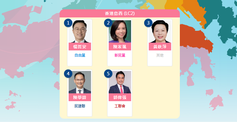 【點新聞報道】12月7日是第八屆立法會選舉投票日,各地區候選人利用最後的機會,力爭當區選民支持。為方便選民選出賢能治港者,點新聞整理港島西五位候選人的政綱及理念。港島西選區包括中西區、南區及離島區,約有34萬選民。該區共有5名候選人,分別為1號楊哲安(自由黨)、2號陳家珮(新民黨)、3號黃秋萍、4號陳學鋒(民建聯)及5號郭偉强(工聯會)。