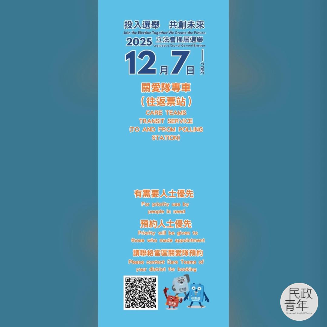【點新聞報道】民政及青年事務局6日在社交平台發文表示,由於有不少關愛隊均收到區內居民的求助,表示希望在12月7日投票,惟票站距離居住地點較遠或交通不方便,希望關愛隊能夠提供接駁交通服務。