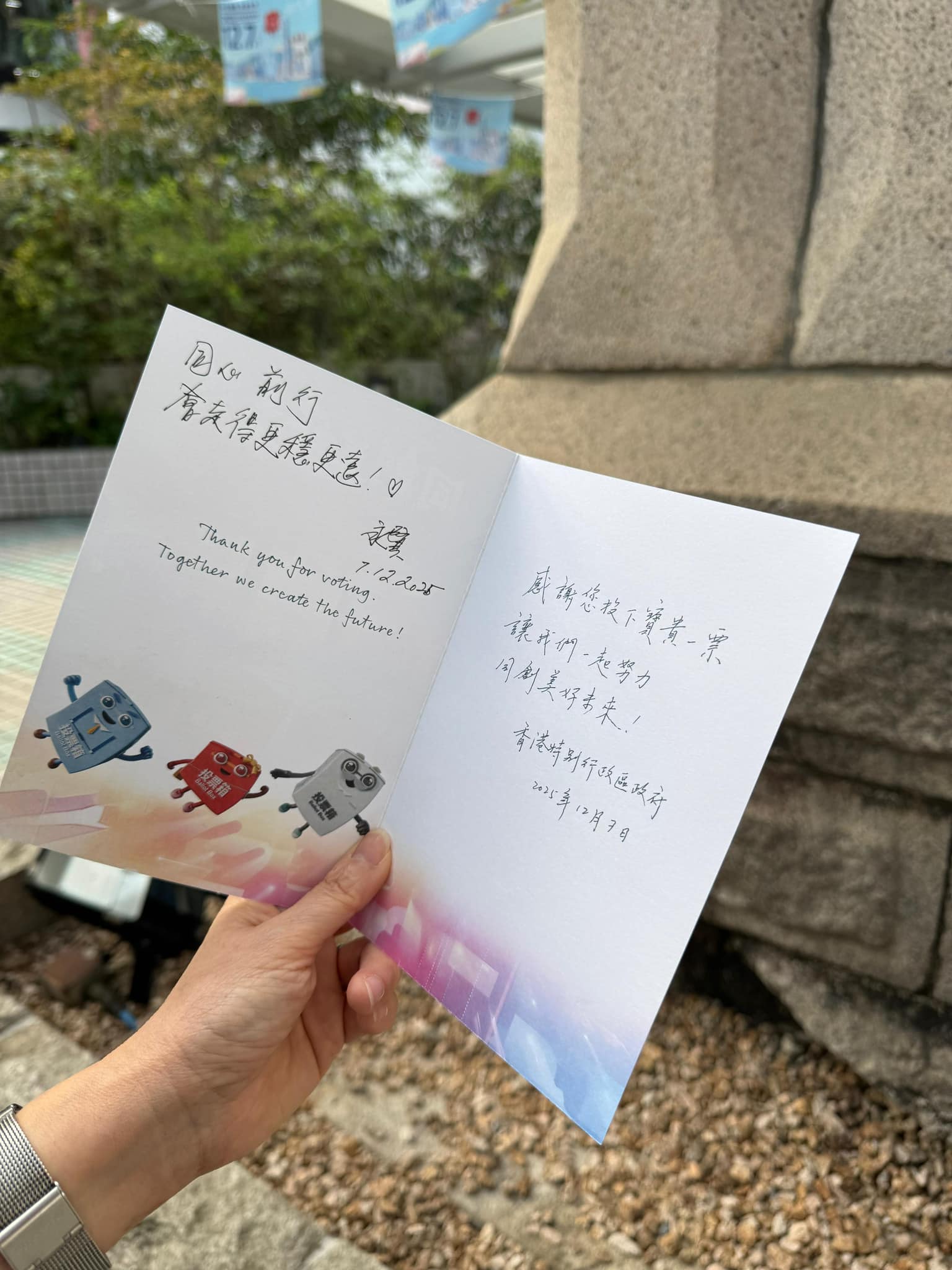 房屋局局長何永賢表示,今日是全港選民為未來投下手上選票、表達心中期望的重要日子。她今天出門的第一件事亦是先去投票,以基本但關鍵的方式出一分力,建設香港。何永賢並在心意謝卡寫上「同心前行 會走得更穩更遠」,表達對香港的心聲,也表達作為政府團隊,希望與立法會這個重要的治港力量,帶領整個社會前行的目標。