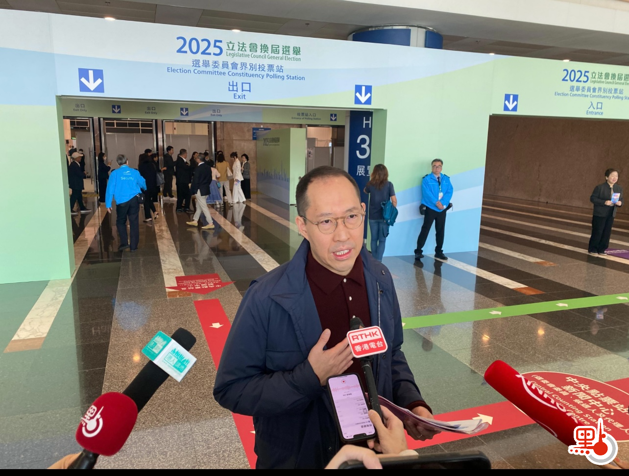 香港北京社團總會會長、全國政協常委施榮懷表示,今早8時許他就來到沙田的街站,為街坊指引投票站位置,再和會裏一些選委會委員前往會展投票。他表示,今日選舉氣氛很好,希望新一屆立法會更加務實有為,高質量地為香港拚經濟、謀發展。他亦提到,投票過程相當順利,選委都很認真去投給自己的「心水」,相信選民都能把握好這次機會。