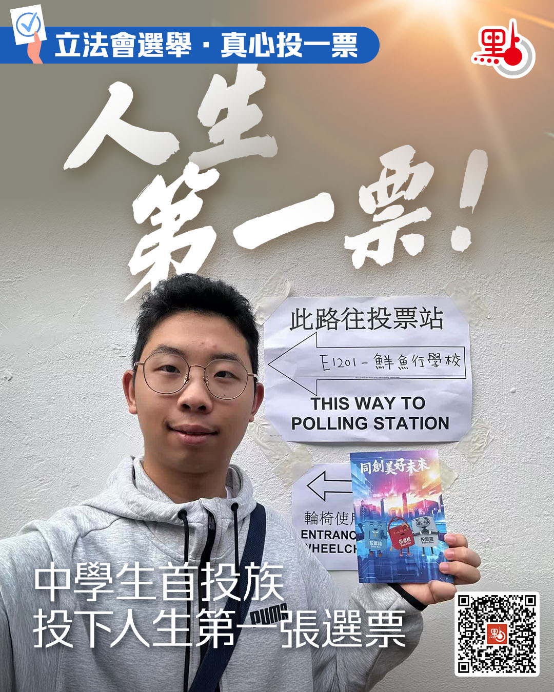 【點新聞報道】立法會換屆選舉今日(12月7日)舉行,一般投票站的投票時間為上午7時30分至晚上11時30分。社會各界積極響應投票,履行作為公民的責任。點新聞記者在多個票站現場觀察到,投票人群中既有百歲老人和輪椅選民,又有中學生首投族、少數族裔、港漂首投族等;點新聞記者還在大埔受影響票站採訪到多位宏福苑災民,他們表示,希望通過投票選出有能力的議員,讓新一屆立法會盡快履職,協助政府進行救災善後工作。點新聞製作了多張海報,快來睇下!