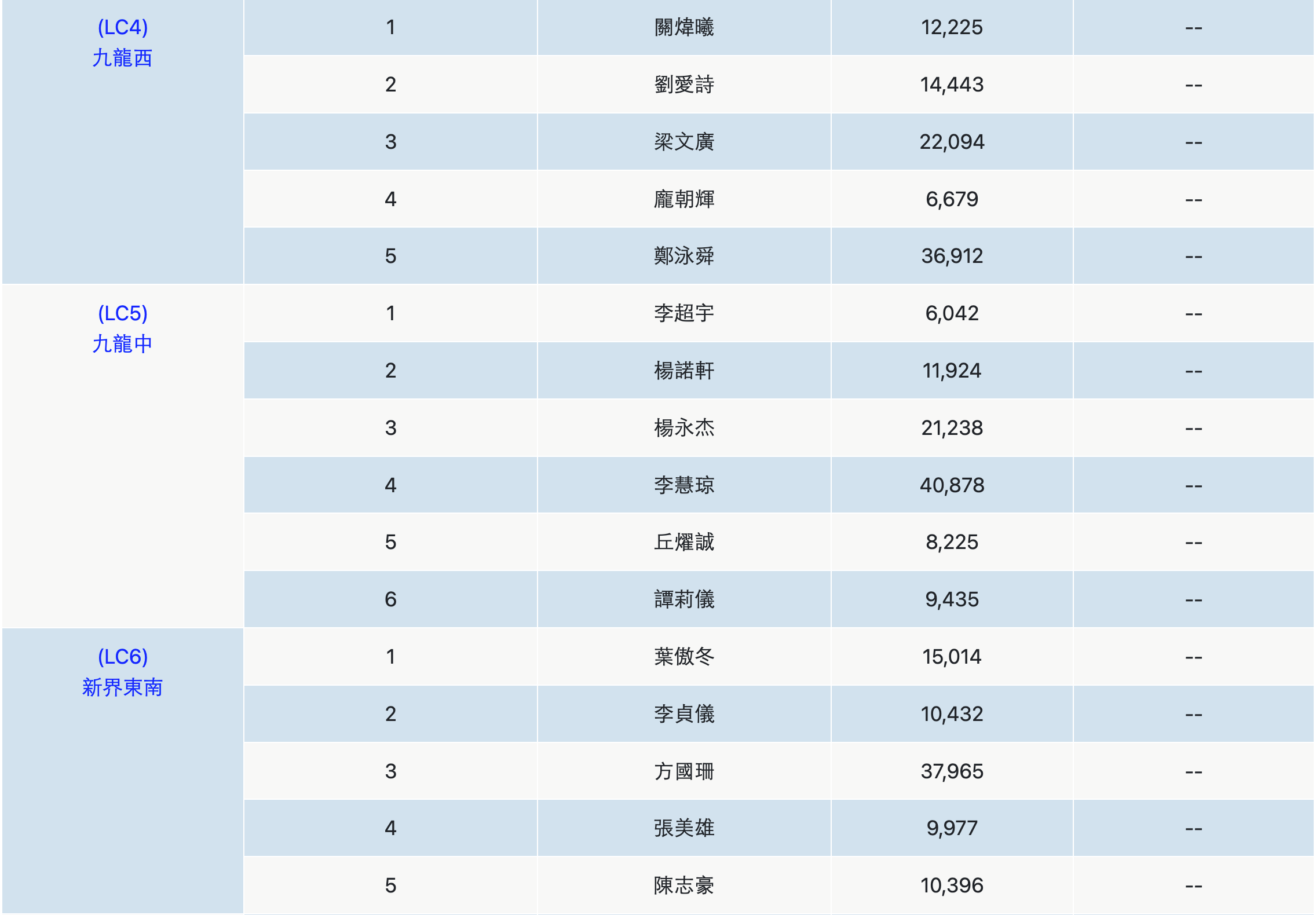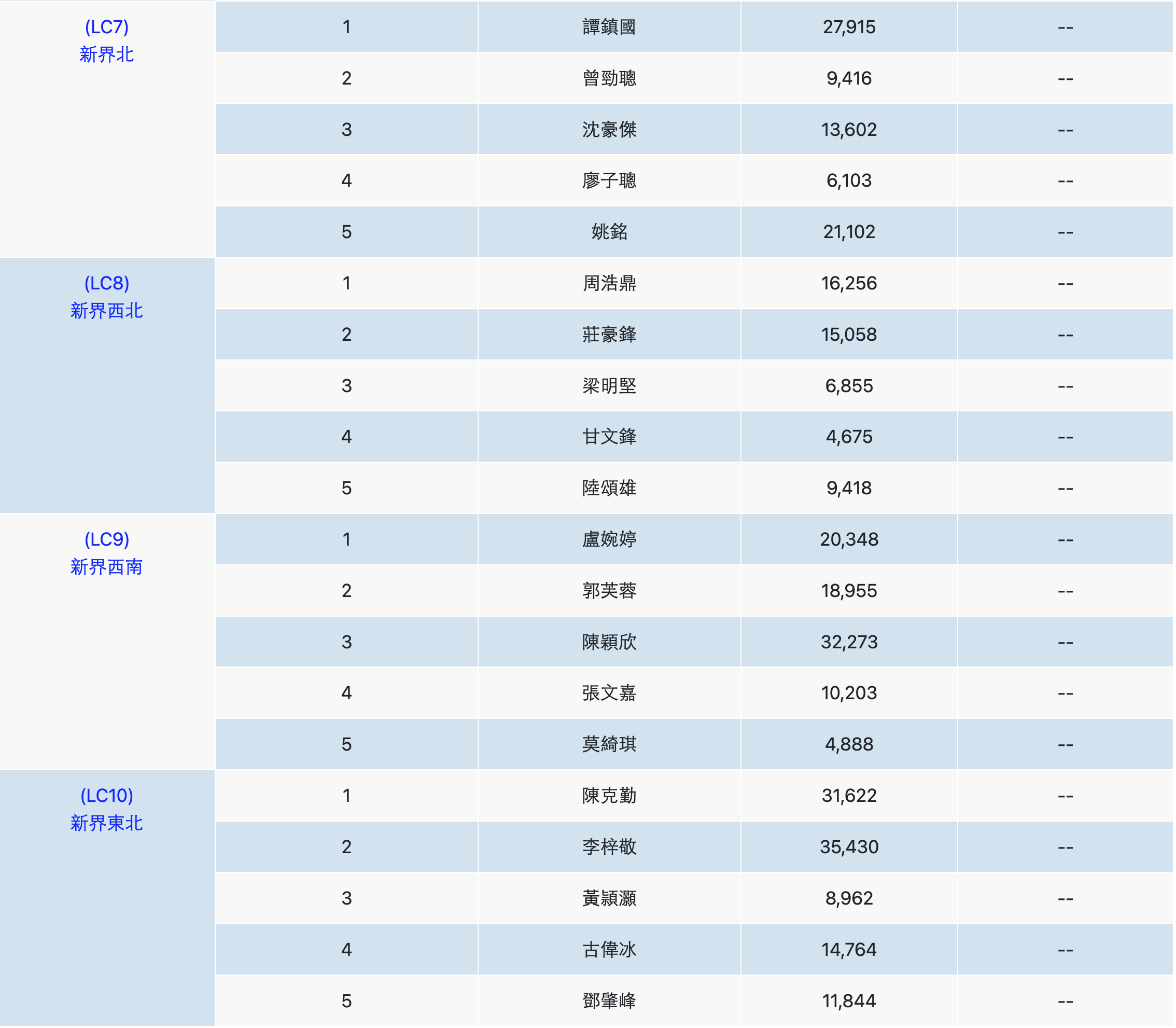 【03:20】截至3時20分內,選舉網站公布10個地方選區候選人暫時所得票數: