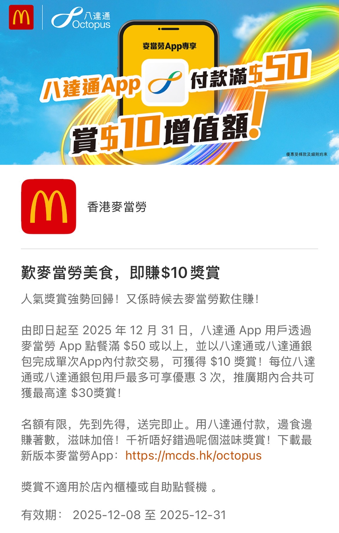 【點新聞報道】「麥當勞x八達通」App支付優惠強勢回歸!由即日起至2025年12月31日,八達通App用戶透過麥當勞App點餐滿$50或以上,並以八達通或八達通銀包完成單次App內付款交易,即可獲取$10八達通增值額獎賞。每位八達通或八達通銀包用戶最多可享優惠3次,推廣期內合共可獲最高達$30獎賞。