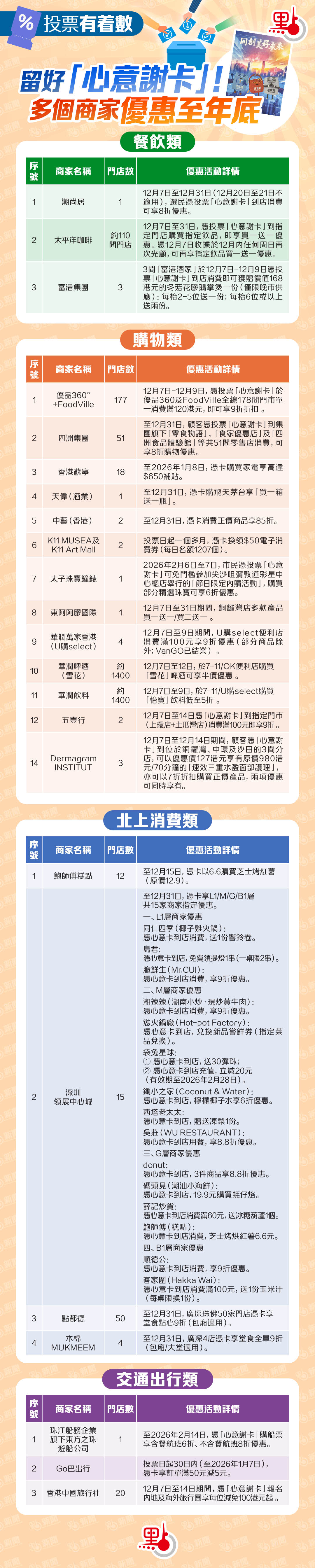 【點新聞報道】2025立法會換屆選舉投票已於昨日(7日)結束,參與投票的每位選民可獲發政府所派的「心意謝卡」一張,憑此可參與此前由香港大公文匯傳媒集團獨家發起的「投票有着數」活動,現有超過1800間門店依然在持續提供優惠,覆蓋餐飲、交通、旅遊、零售、美容等領域,部分優惠甚至持續至明年2月。