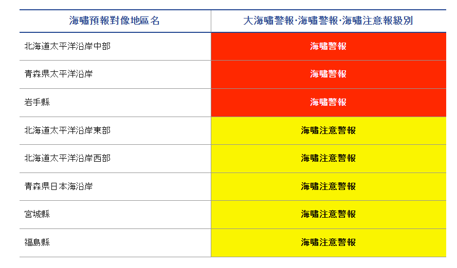 日本氣象廳向北海道太平洋沿岸中部、青森縣太平洋沿岸、岩手縣發出海嘯警報。據新華社報道,日本當地時間11時40分,北海道浦川町預計會出現3米高的海嘯,惠里茂鎮和十勝港分別在11時50分,以及9日凌晨12時也會出現3米高的海嘯。
