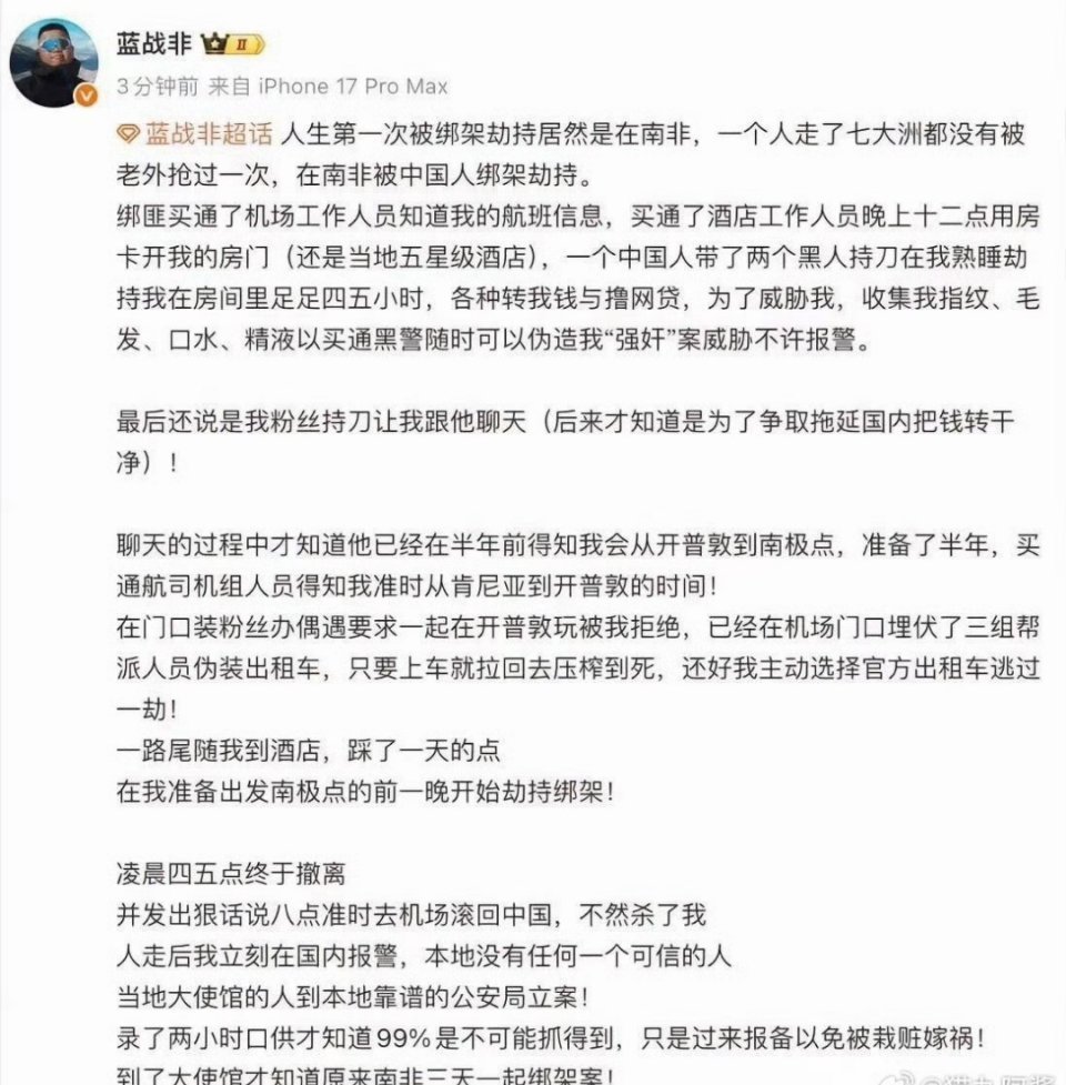 藍戰非在文中透露,綁匪疑似提前半年布局,曾偽裝粉絲在機場偶遇未果,後在酒店房間實施夜間劫持。藍戰非說,最後因選擇官方的士而躲過更危險的誘捕。綁匪據稱買通機場與酒店人員,掌握其行程,並試圖脅迫其轉賬、申請網貸,同時收集指紋、毛髮、精液等生物信息以威脅偽造「強姦」案阻止報警。事發後,藍戰非立即向國內及中國駐當地使館報警,但被告知破案概率極低,報警主要為防被栽贓。