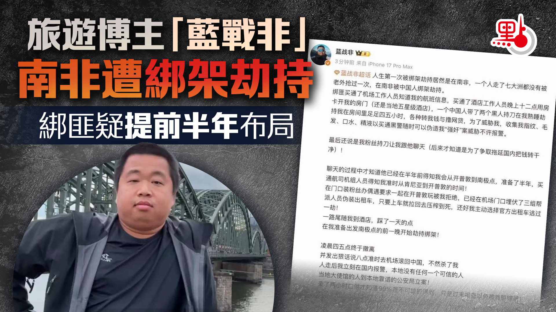 旅遊博主「藍戰非」南非遭綁架劫持 綁匪疑提前半年布局