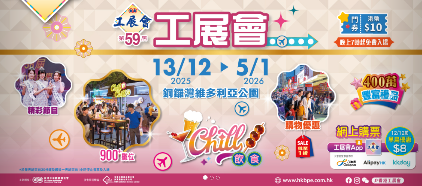 【點新聞報道】第59屆工展會將於2025年12月13日2026年1月5日在維多利亞公園舉行,今次展會佔地約2.8萬平方米,並呈現12大展區超過900個戶外攤位,展區包括香港名牌廣場區、食品飲料區、糧油麵食區、參茸海味湯料區、生活家居區、家鄉風味區、樂齡活力區及推廣區等。展會入場費用為10港元,身高1米或以下小童、65歲或以上長者及殘疾人士免費進場。