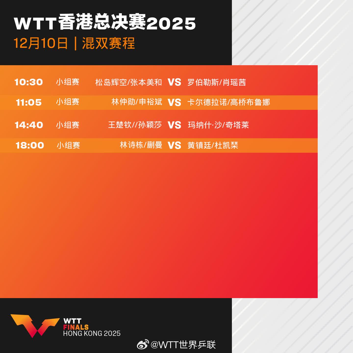 今日是比賽首日,混雙上演多場精彩對戰,包括「莎頭組合」王楚欽/孫穎莎今日下午2時40分對陣印度組合瑪納什·沙/奇塔萊,港隊組合「黃杜配」黃鎮廷/杜凱琹今日下午6時將迎戰國乒隊「動漫」組合林詩棟/蒯曼。