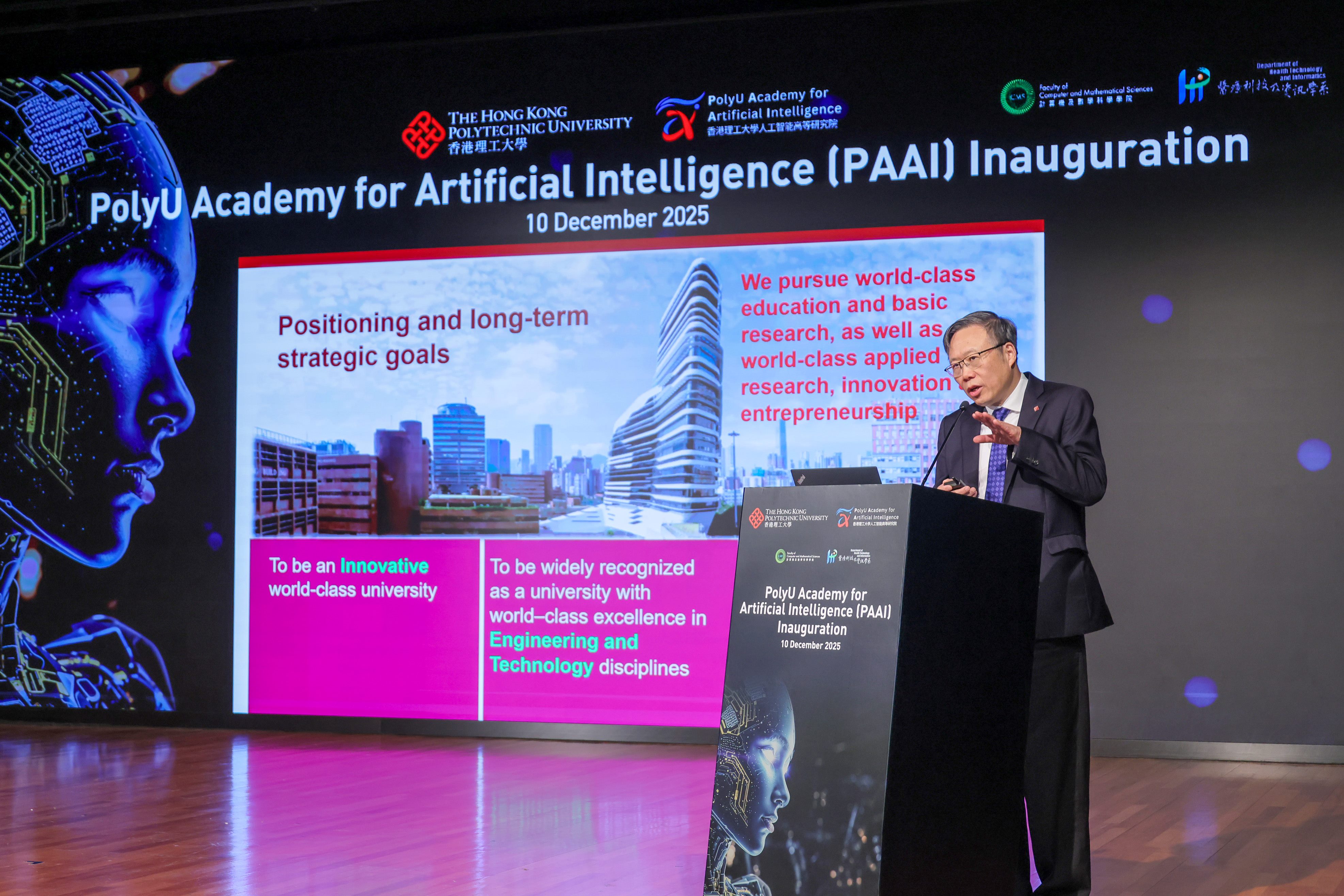理大校長滕錦光表示:「理大於AI、計算機科學、數學、數據科學及其他備受全球認可學科建立了穩固基礎,PAAI將運用此優勢,促進跨學科與國際合作,推動AI發展,將香港與粵港澳大灣區定位為領先的AI創新樞紐。這所高等研究院將為醫療健康、金融以至教育等不同重點領域,提供可持續、高效且具影響力的解決方案,並善用香港的國際化科研環境及其政產學研網絡,構建人才培養生態系統,推動未來創新。」