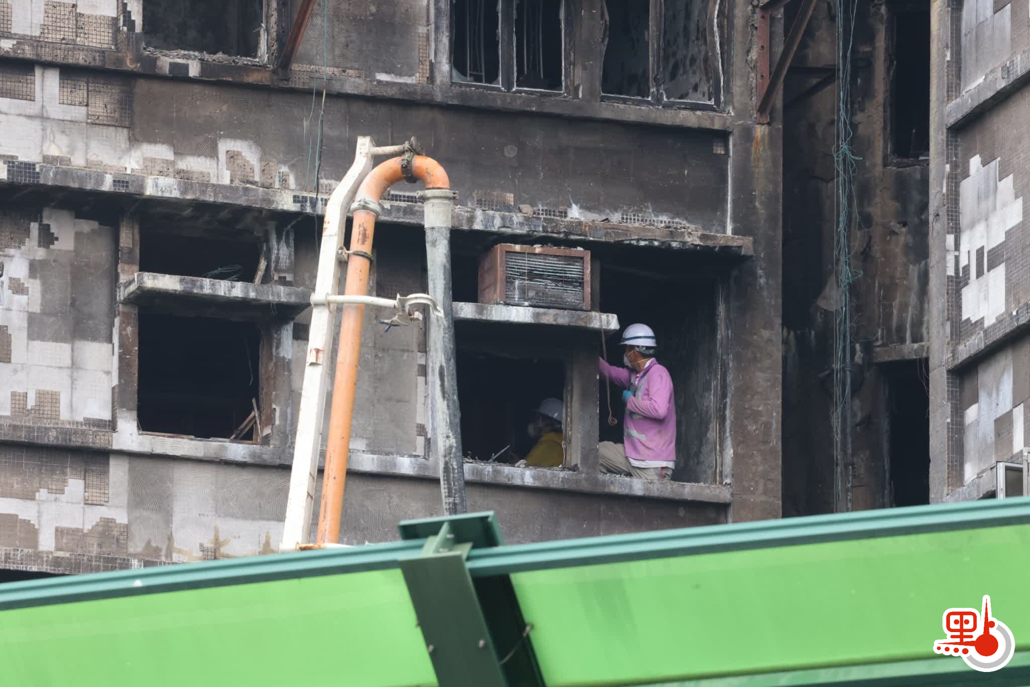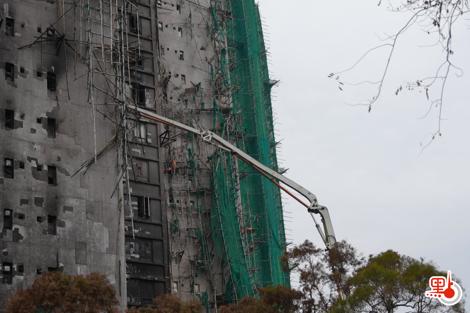 【點新聞報道】大埔宏福苑發生五級火警,造成嚴重傷亡,今日(10日)早上警方及消防處等相關部門人員繼續到場展開調查及現場清理工作,其間有吊臂車及石屎泵車等工程車抵達,相信為受大火嚴重焚燒的大廈進行鞏固結構,以及清理棚架竹枝及瓦礫等雜物,但見部分大廈的棚架被拆除後,露出嚴重焦黑外牆和窗戶;其間有工人操控石屎泵車向宏昌閣進行灌漿加固工程。